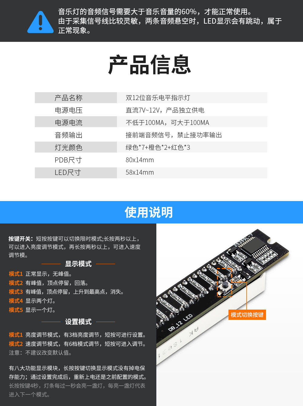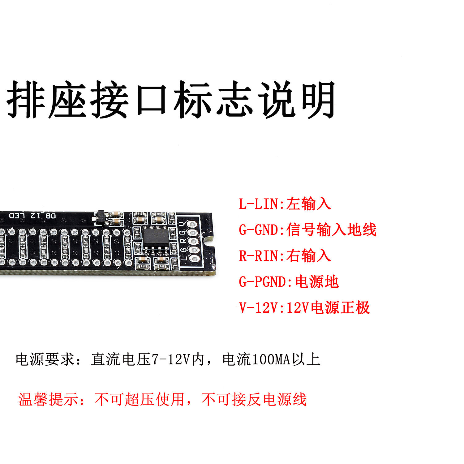 特点: 1.双12位音乐屏谱电平超小体积立体声电平灯,可自由调节灯条的上升、下降速度和峰值灯的停留时间、下降速度。每个灯单独设置一个限流电阻,既保证不同颜色灯的亮度一致,更保证在灯亮得 多的 情况下不存在灯亮暗变化的情况。信号输入经过运放隔离避免单片机高频干扰串入音频中。