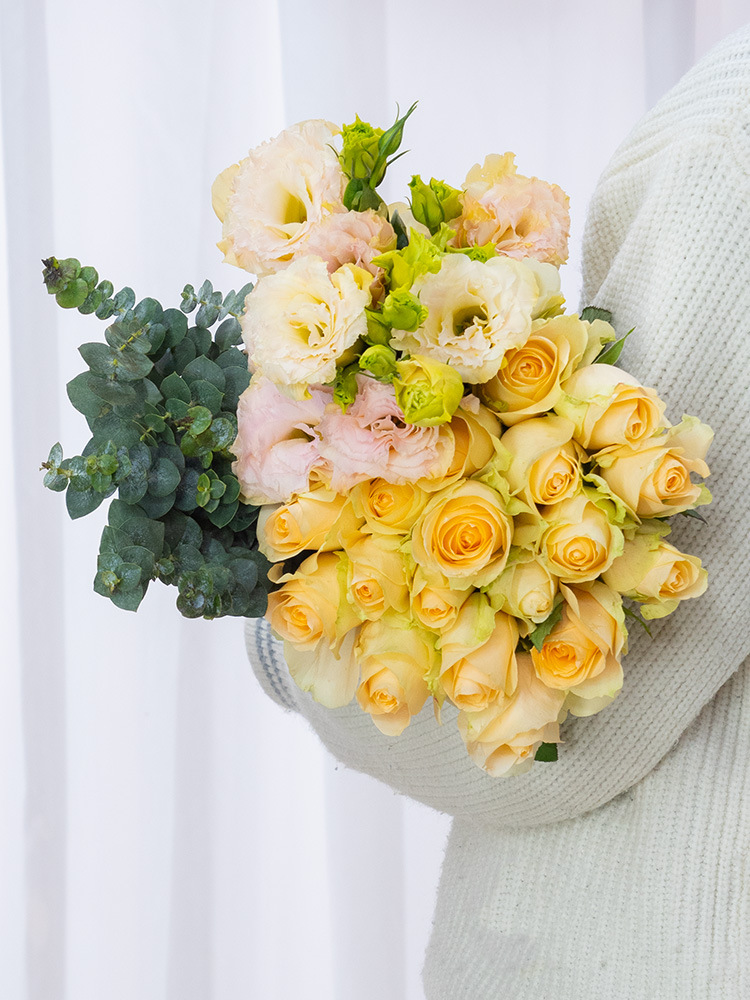 • 10 개의 무작위 장미 10 eustoma grandiflorum 10 유칼립투스 잎