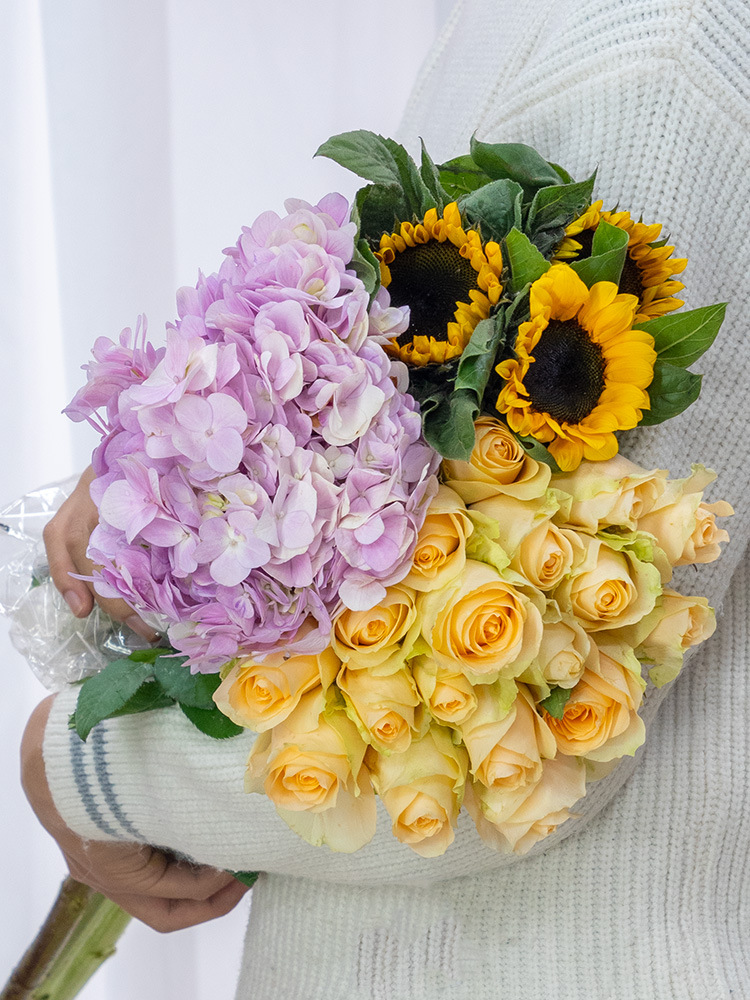 • 임의의 장미 10 개 + 해바라기 3 개 + 수국 1 개