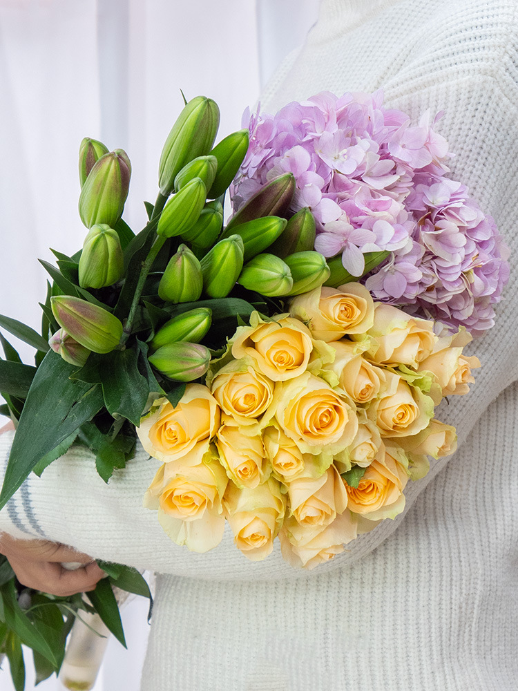• 무작위 장미 10 개 + 무작위 백합 5 개 + 수국 1 개