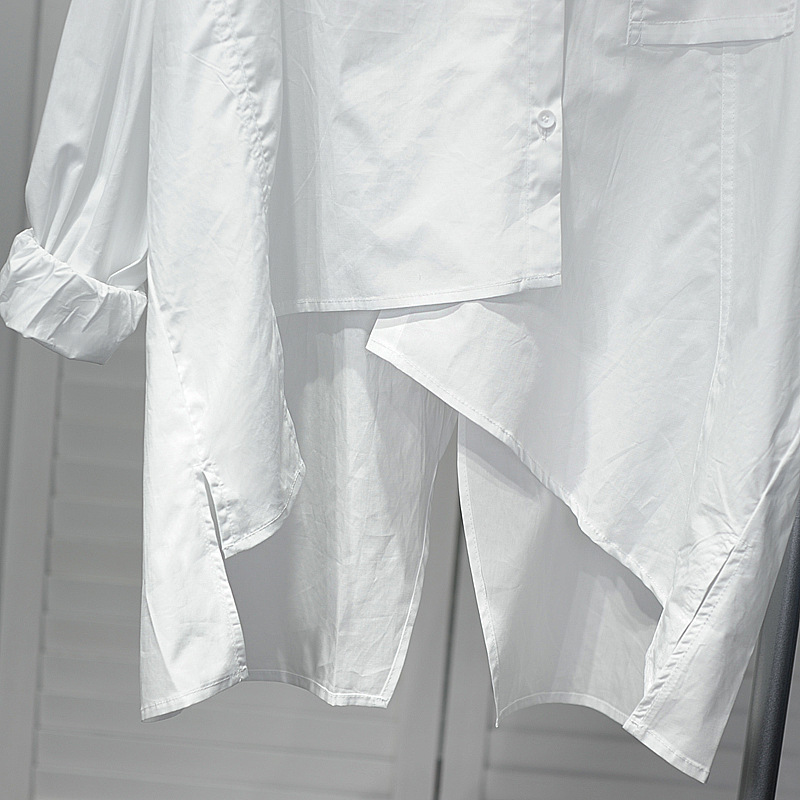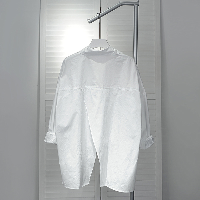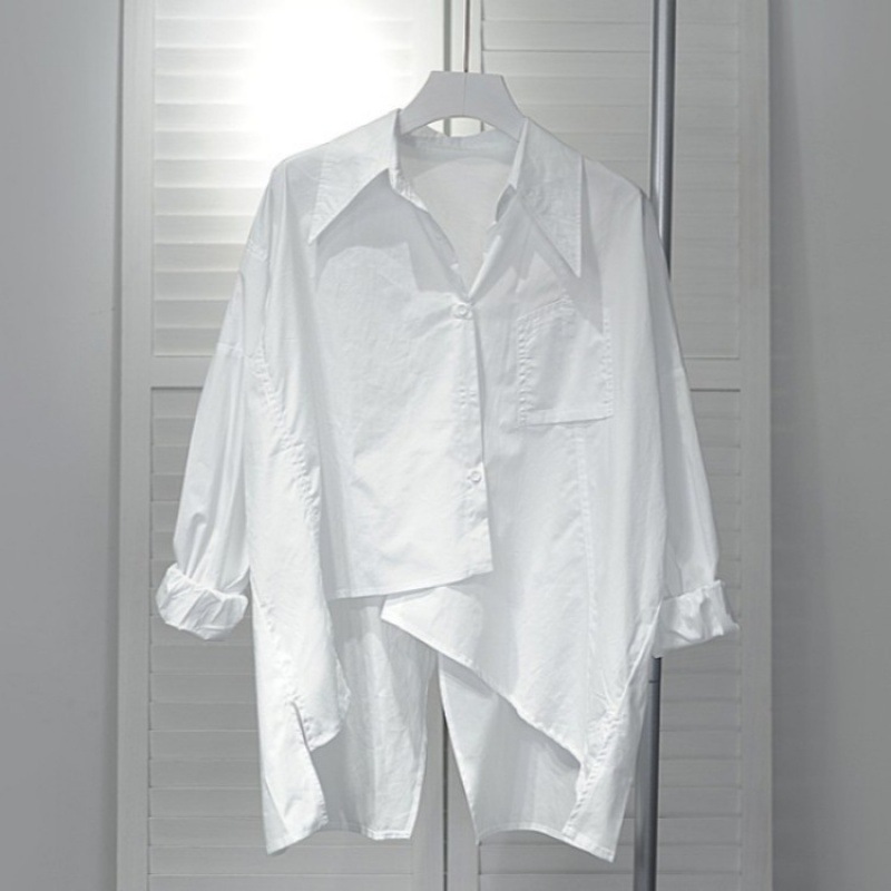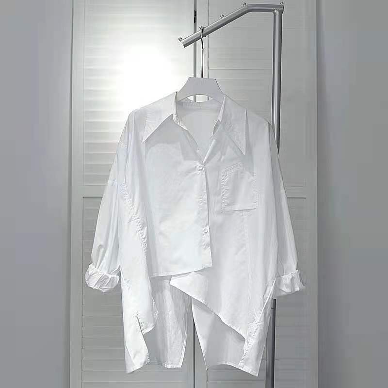 한국 동대문 2023 봄 가을 새로운 한국 스타일 얇은 루즈 백 슬릿 긴팔 불규칙 셔츠 여성 유행스토어 가기