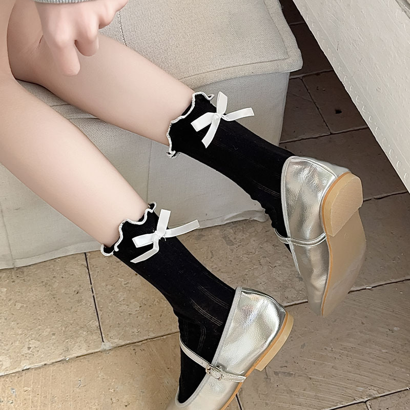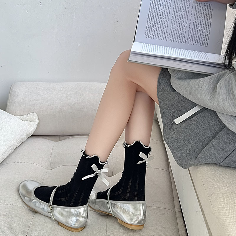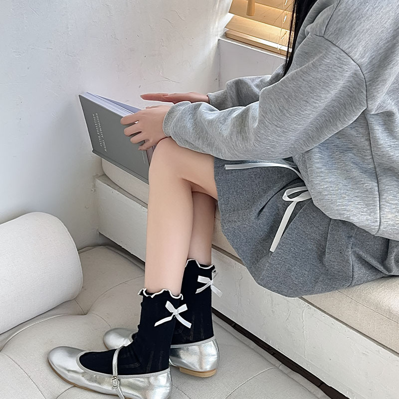 여성 힐 나비 매듭 양말 일본 소녀 스타일 봄과 여름 얇은 회색 중간 종아리 길이 양말 작은 가죽 신발 더미 양말스토어 가기