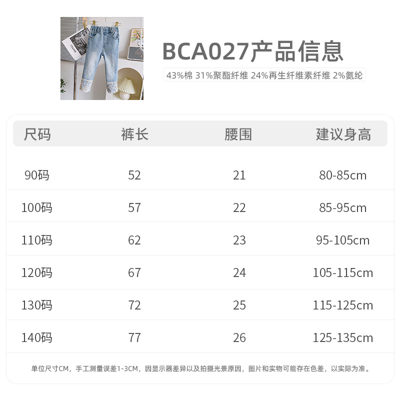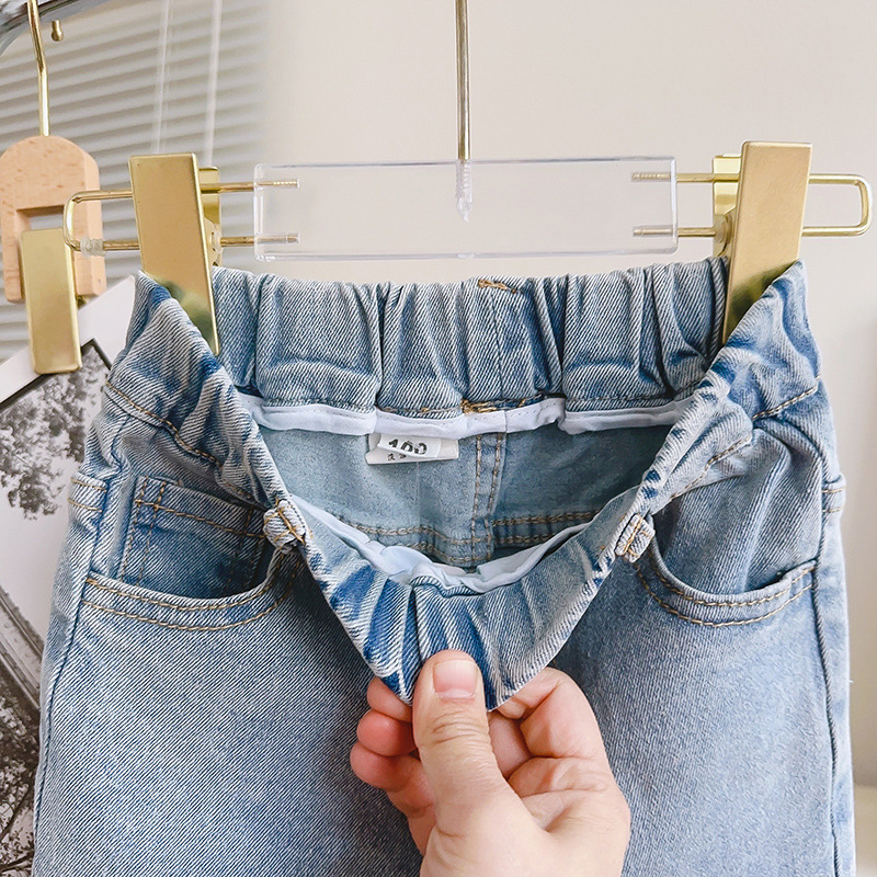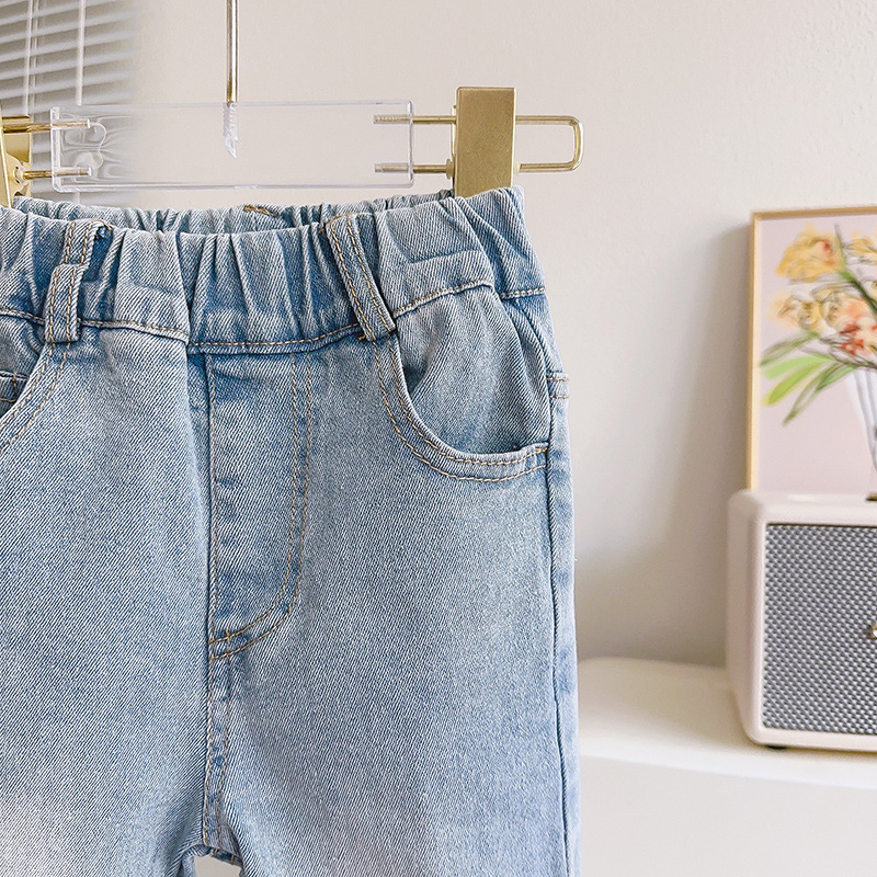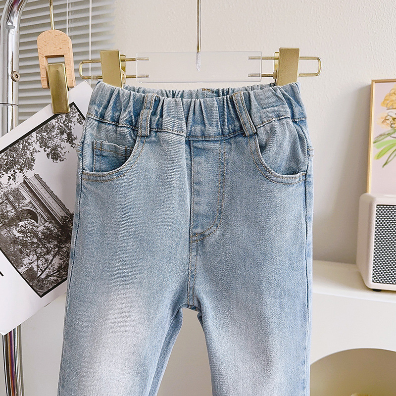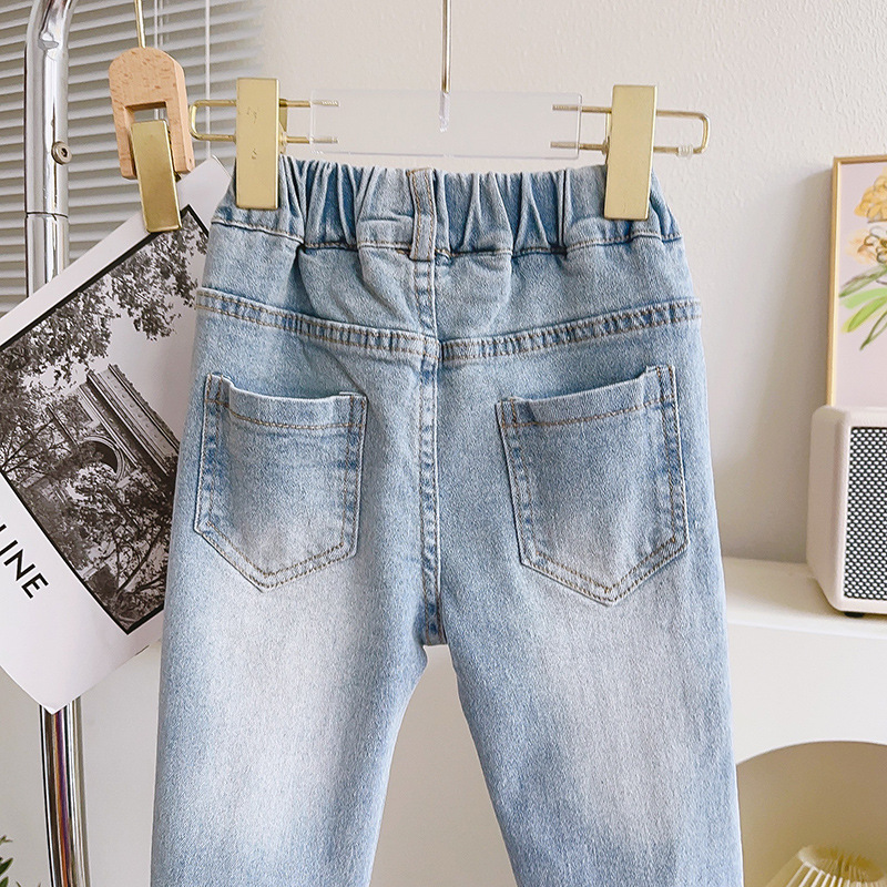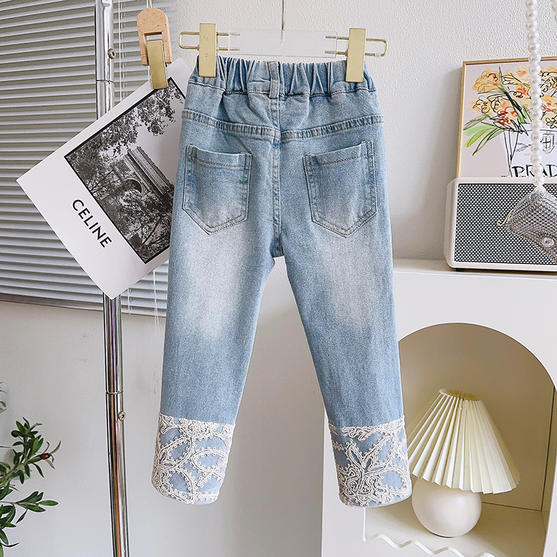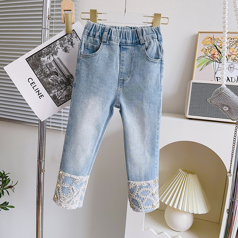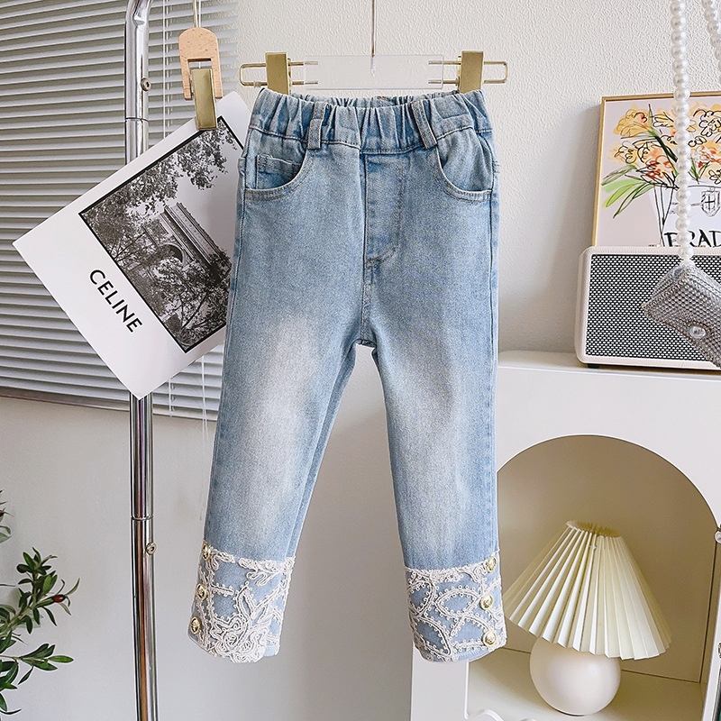 걸스 슬림 핏 청바지 2024 봄 새로운 유행 유행 아기 소녀 레이스 청바지 국경 배달스토어 가기