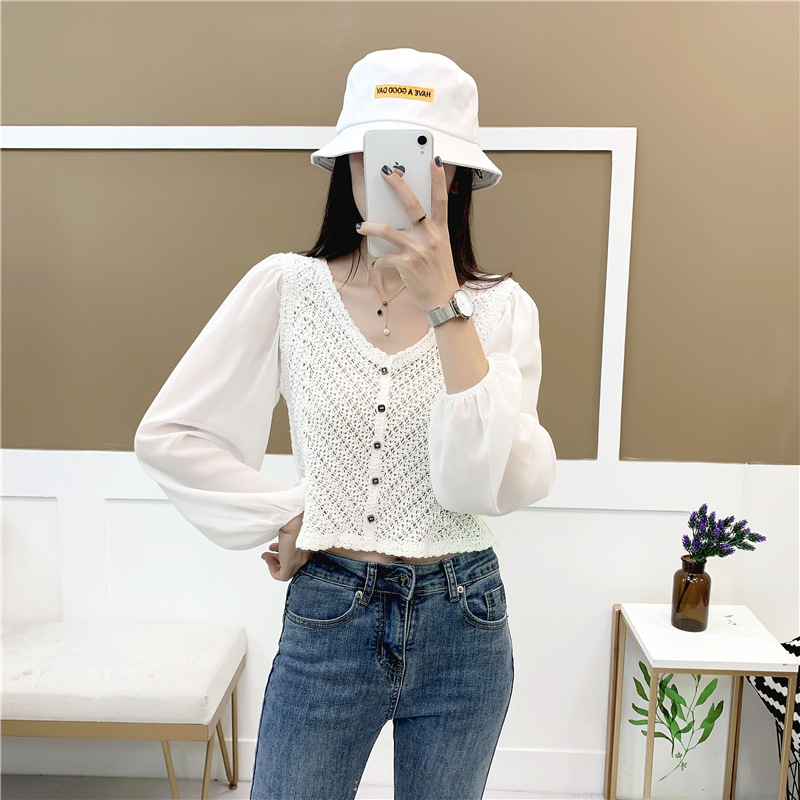이른 봄 2024 일본식 속이 빈 싱글 브레스트 스티칭 원근법 쉬폰 소매 달콤한 짧은 셔츠 탑