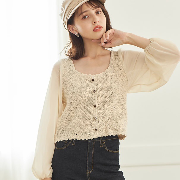 이른 봄 2024 일본식 속이 빈 싱글 브레스트 스티칭 원근법 쉬폰 소매 달콤한 짧은 셔츠 탑스토어 가기