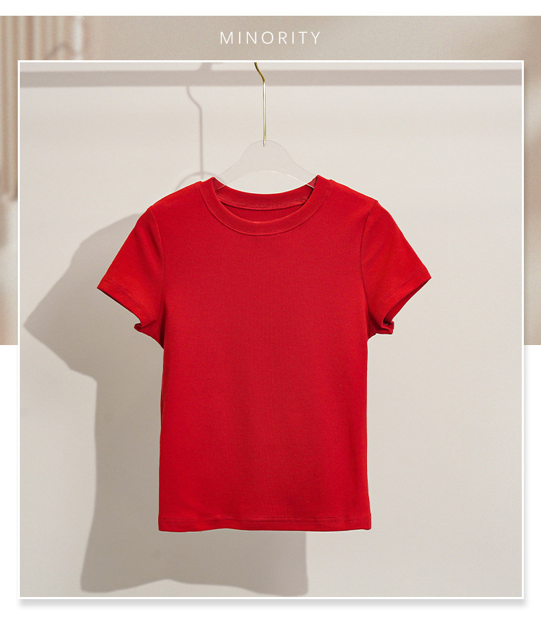 Xiaozhong 2024 봄과 여름 새로운 올 매치 솔리드 컬러 라운드 넥 코튼 심플 슬림 핏 반팔 티셔츠 여성용
