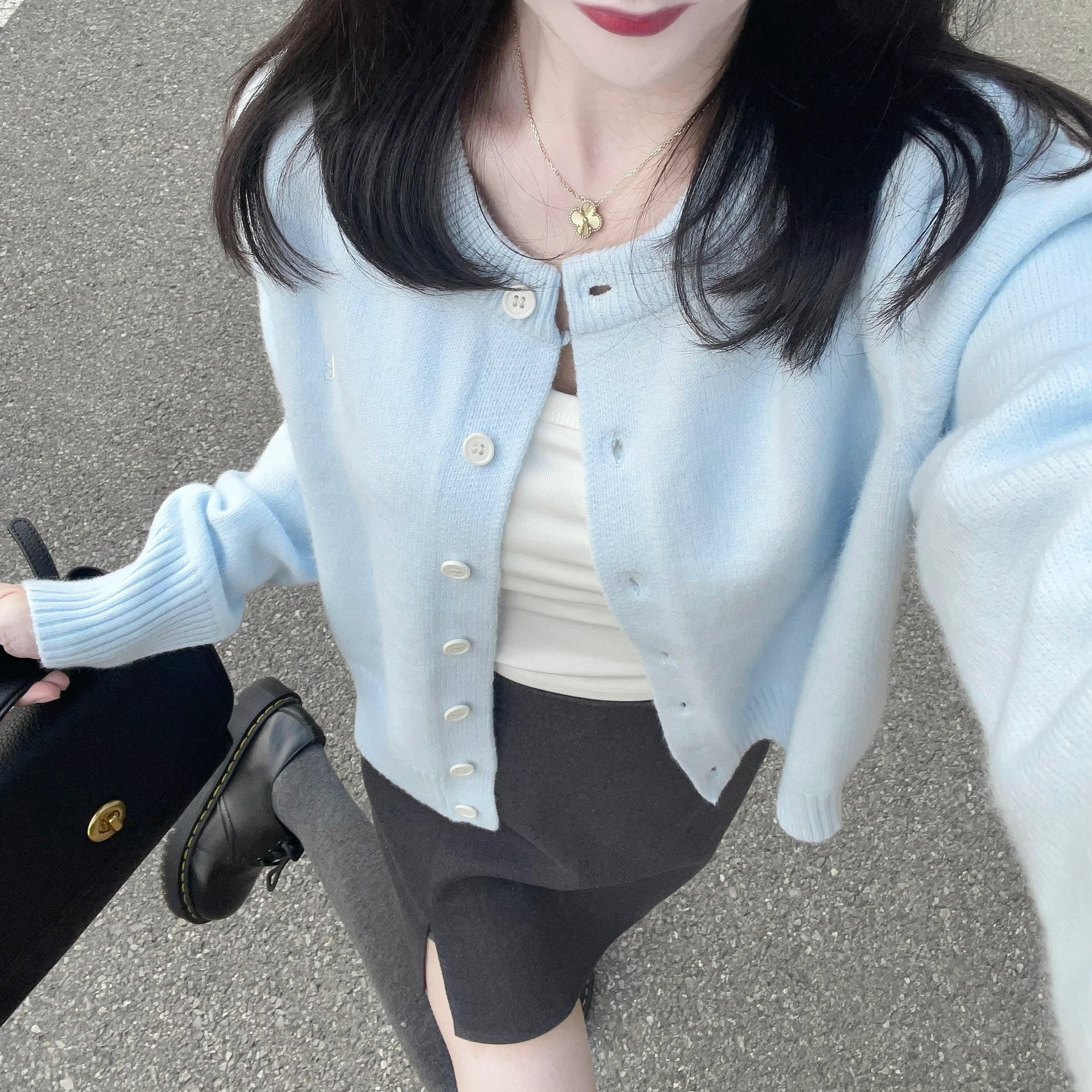 한국 스타일의 부드러운 찹쌀 느낌 라이트 블루 니트웨어 봄 스웨터 여성 코트 새로운 간단한 짧은 외부 카디건 탑스토어 가기