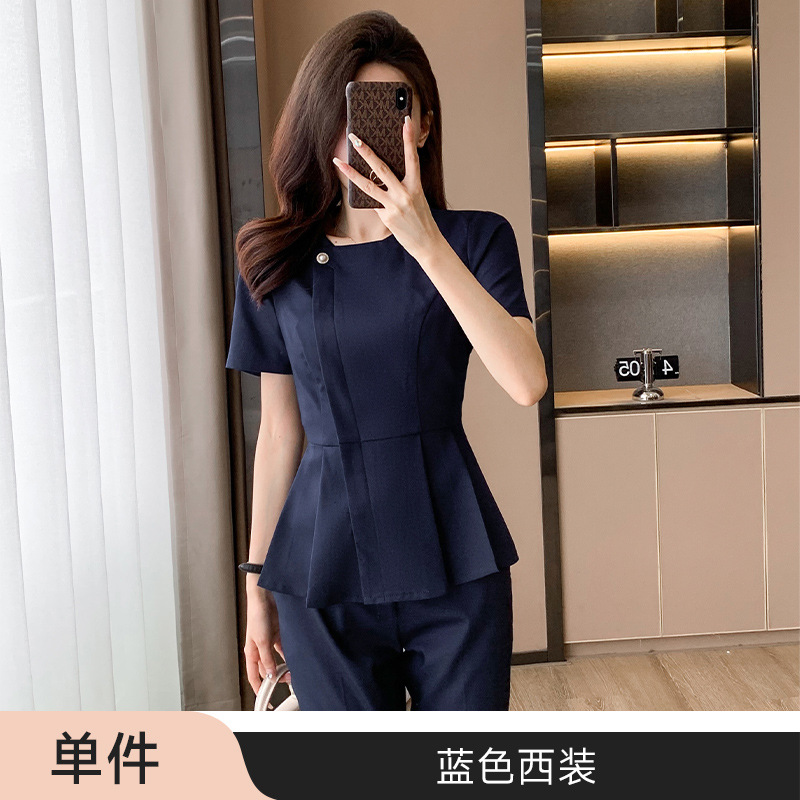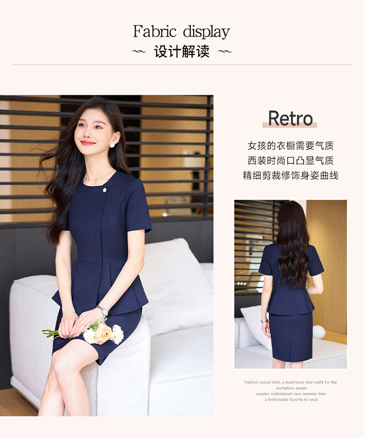 여름 슬림 핏 슬리밍 쇼트 스커트 비즈니스 우아한 다크 블루 통근 원피스 프런트 데스크 매니저 작업복 착용스토어 가기