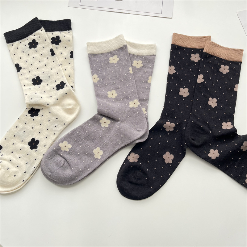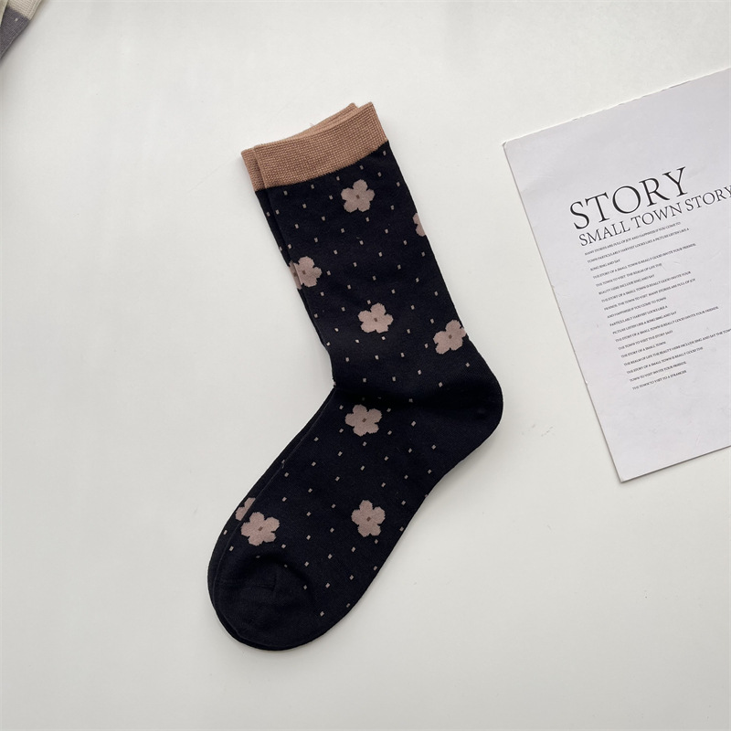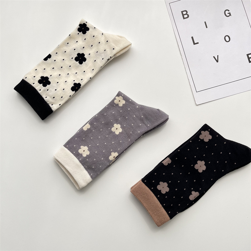 여성 양말 일본 복고풍 색상 일치 중간 종아리 길이 양말 봄과 여름 귀여운 꽃 면화 양말 한국식 올 매치 작은 여성 양말 새로운스토어 가기