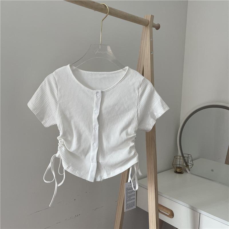 한국 걸스 디자인 센스 니쉬 카디건 반팔 티셔츠 여름 드로우 스트링 세련된 반소매 티셔츠 탑 트렌디