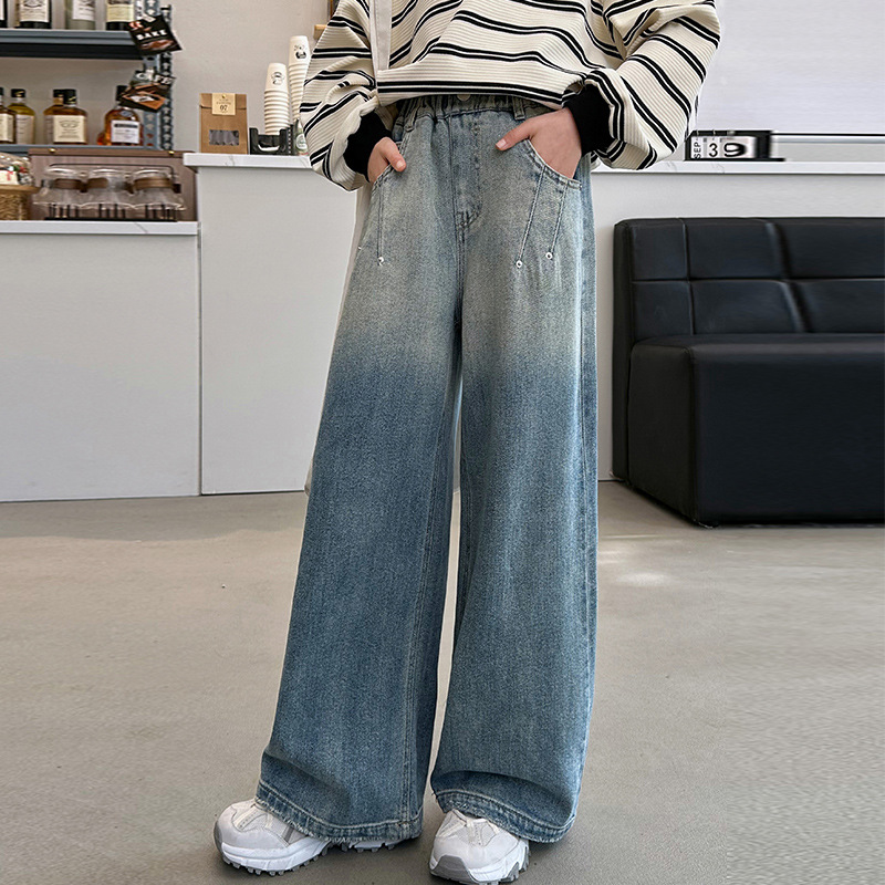 소녀의 넓은 다리 바지 봄과 가을 2024 새로운 어린이 서양식 큰 어린이 데님 바지 봄 다재다능한 캐주얼 와이드 레그 바지스토어 가기