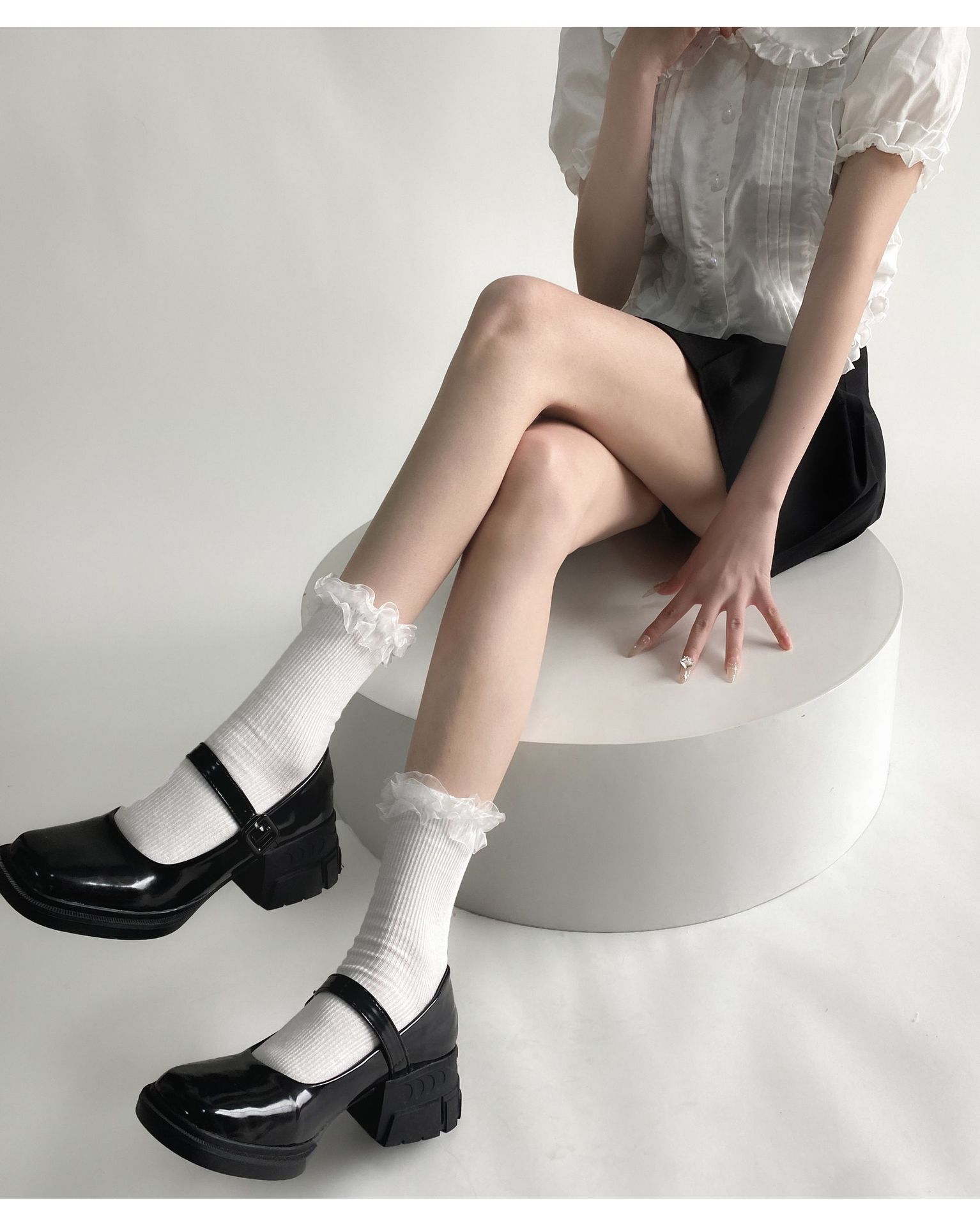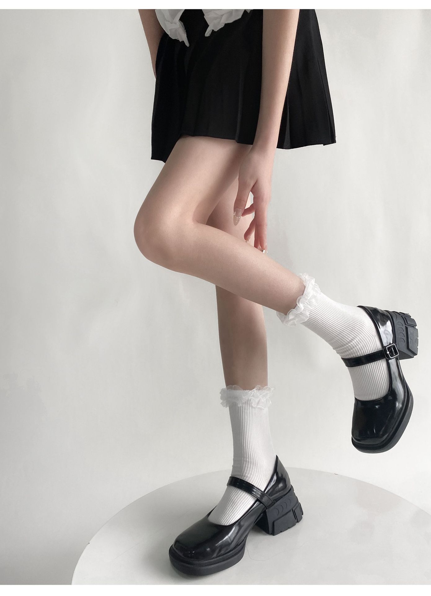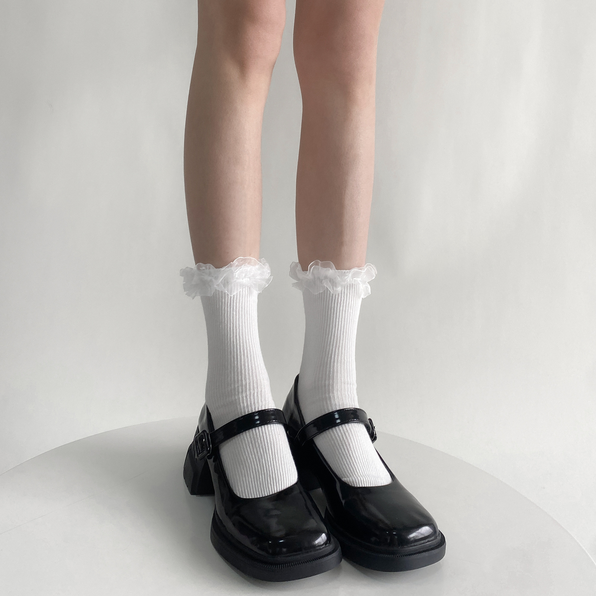 일본식 달콤한 로리타 흰색 메쉬 세로 줄무늬 더미 양말 슬리밍 JK 실 코튼 양말 여성의 중간 종아리 길이 양말스토어 가기