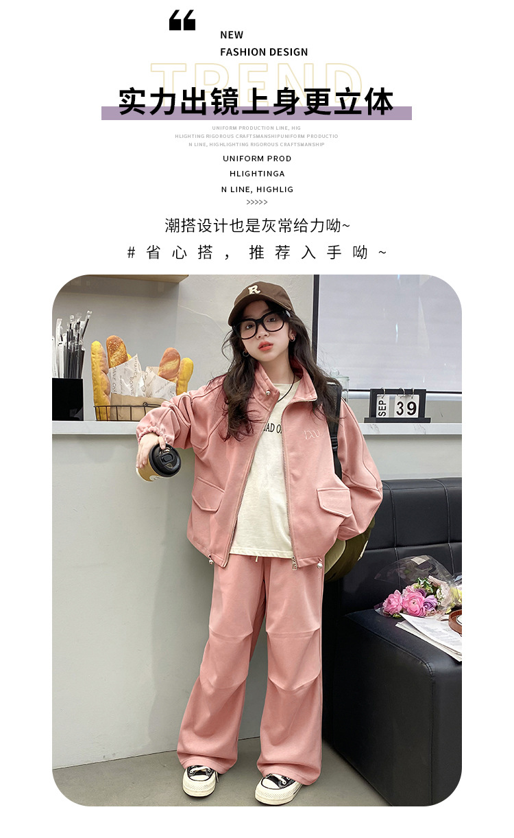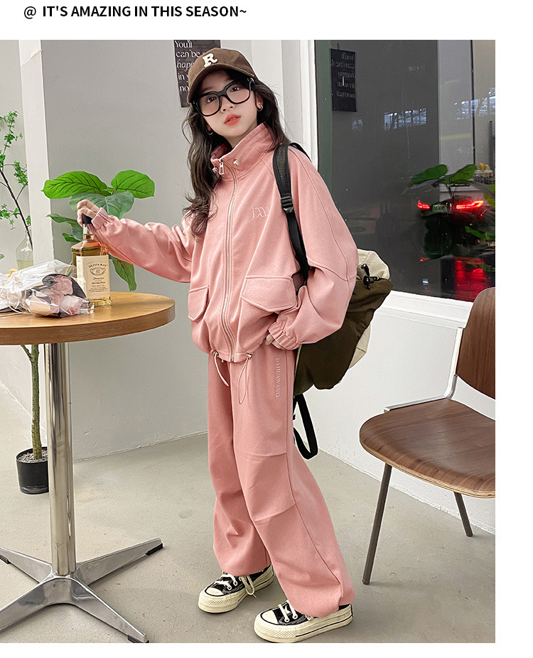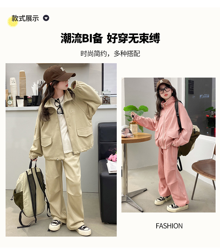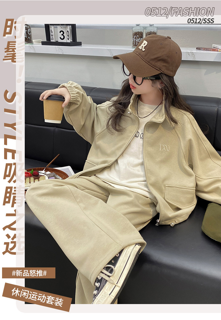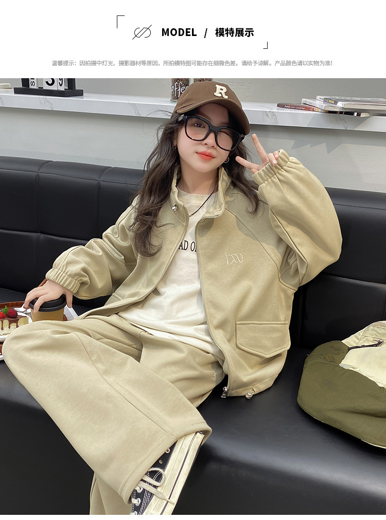 소녀의 봄과 가을 스포츠 세트 2024 새로운 중형 및 대형 어린이 봄 캐주얼 스탠드 칼라 스웨터 작업복 스타일 투피스 세트스토어 가기
