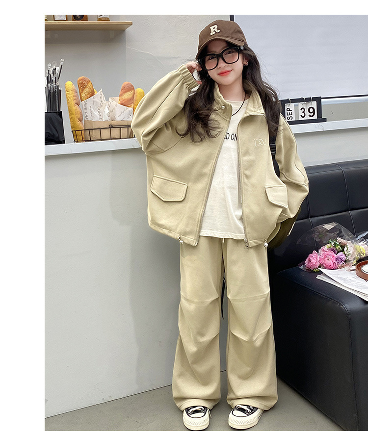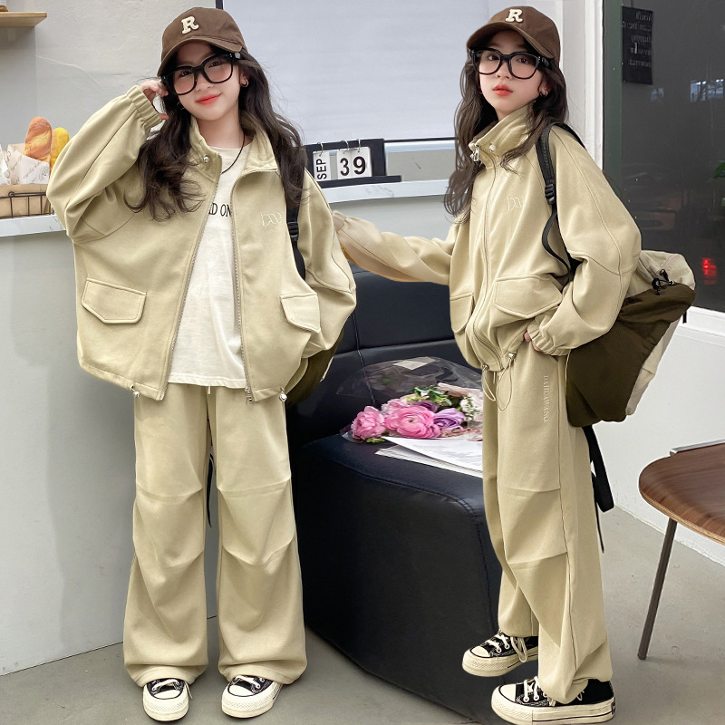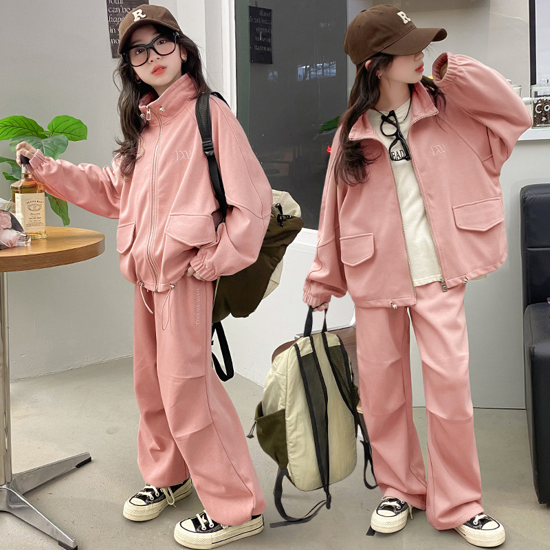 소녀의 봄과 가을 스포츠 세트 2024 새로운 중형 및 대형 어린이 봄 캐주얼 스탠드 칼라 스웨터 작업복 스타일 투피스 세트