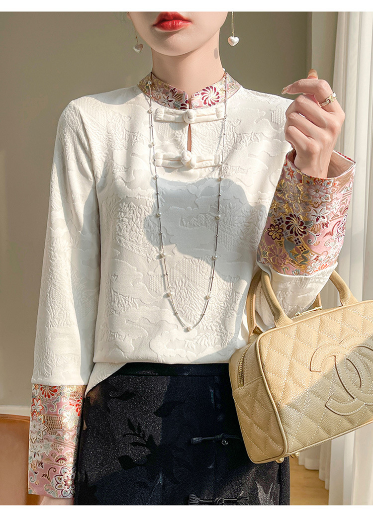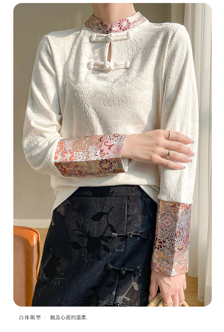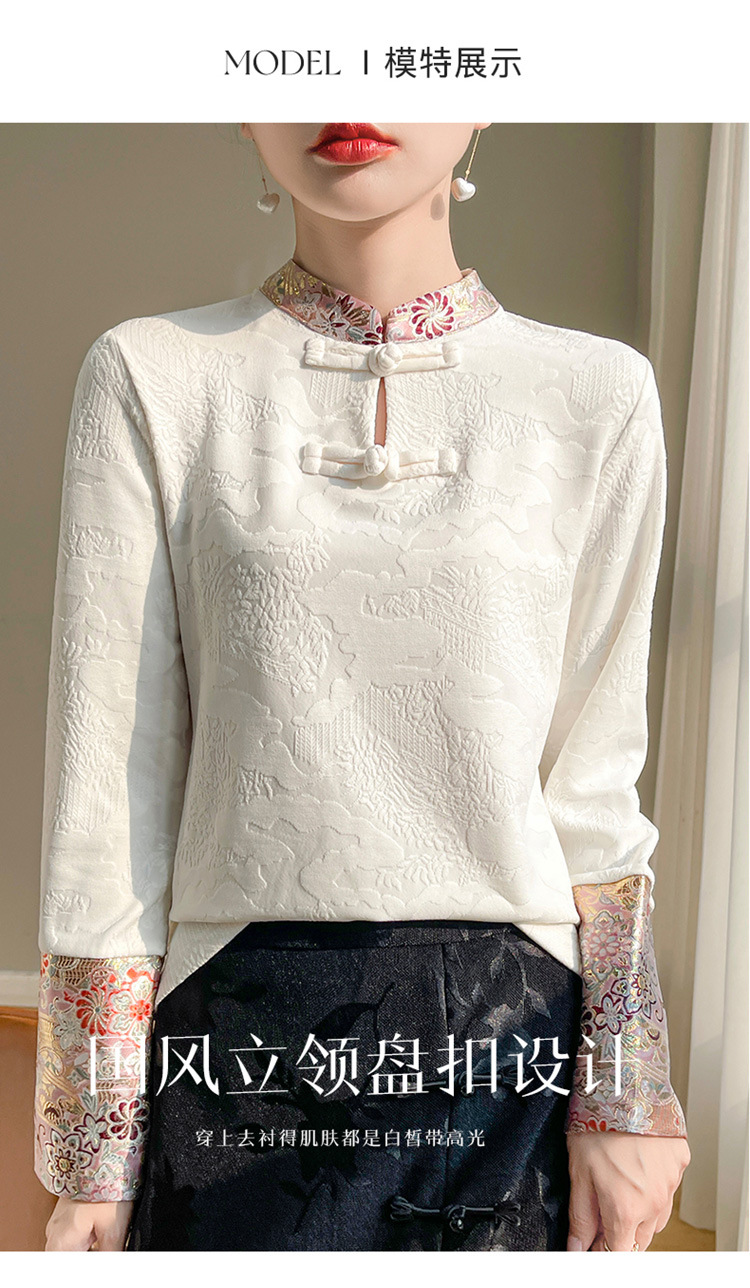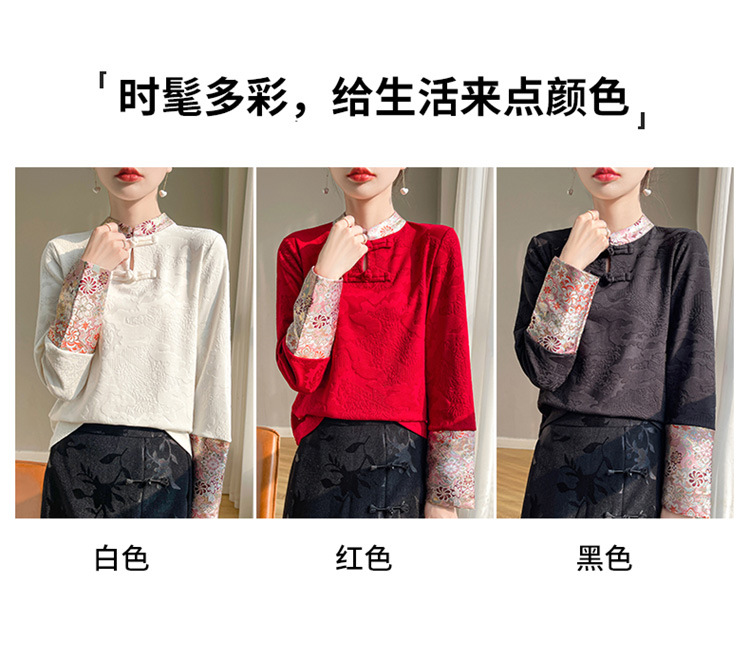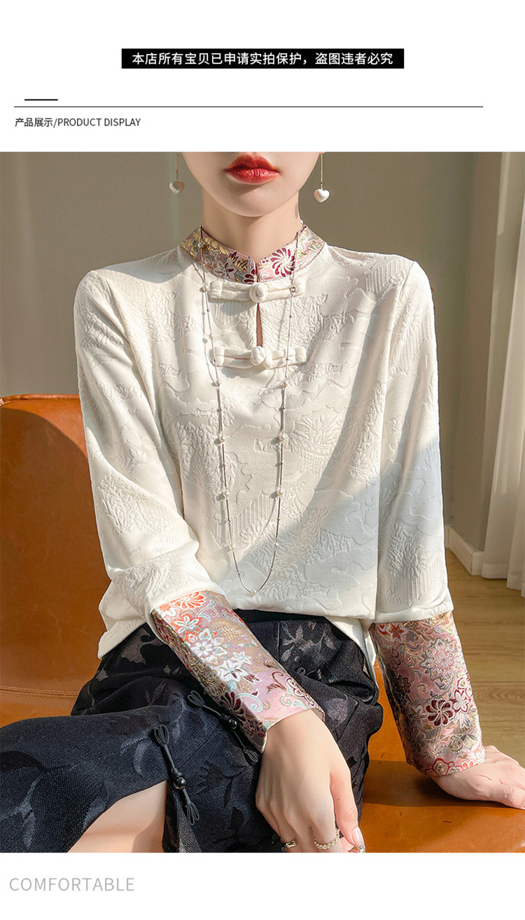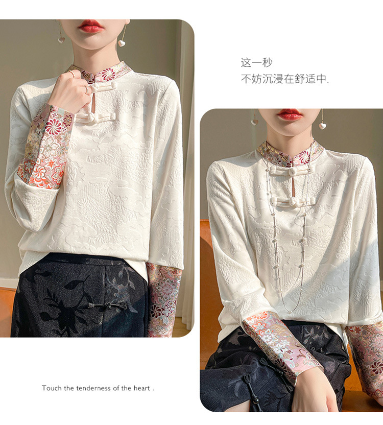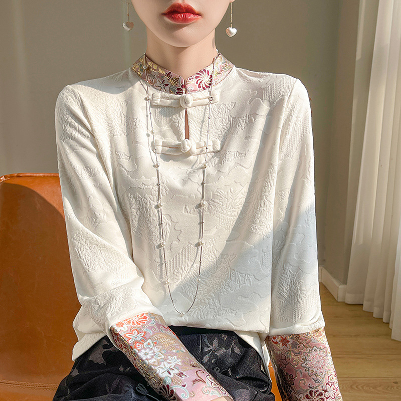 여성 국가 스타일 새틴 셔츠 화이트 2024 봄 셔츠 새로운 중국 스타일 버클 긴 소매 셔츠 자수 탑스토어 가기