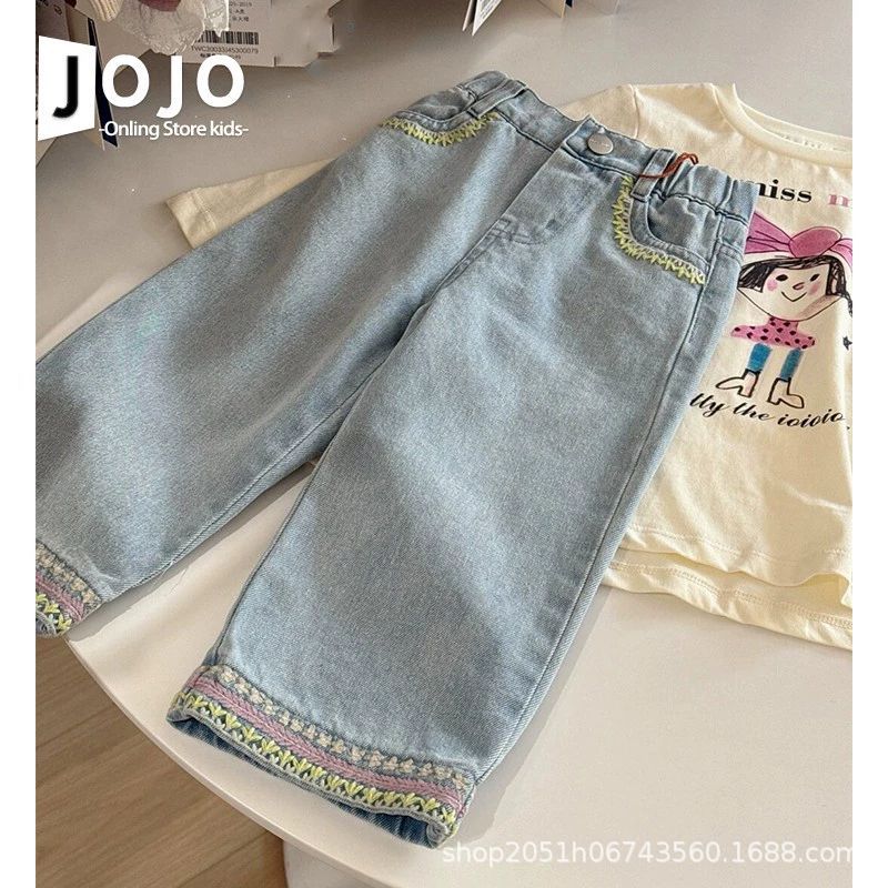 한국식 아동복 소녀 바지 아기 봄 서양식 샤넬 스타일 레이스 와이드 레그 바지 어린이 라이트 블루 청바지
