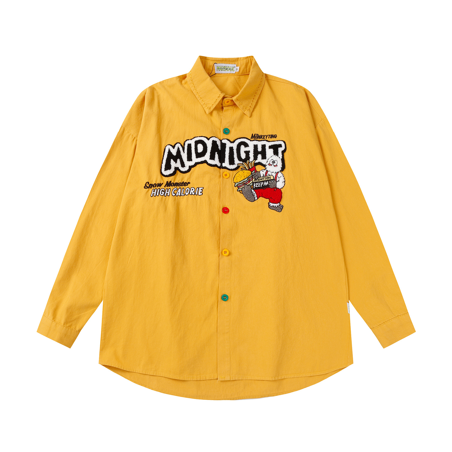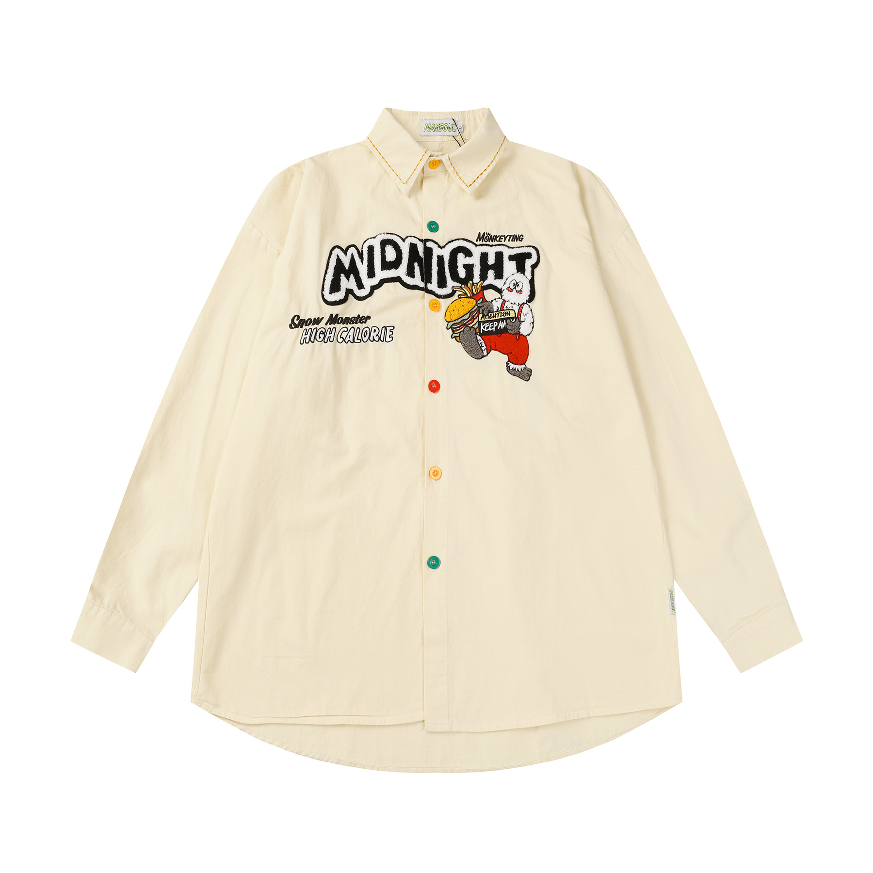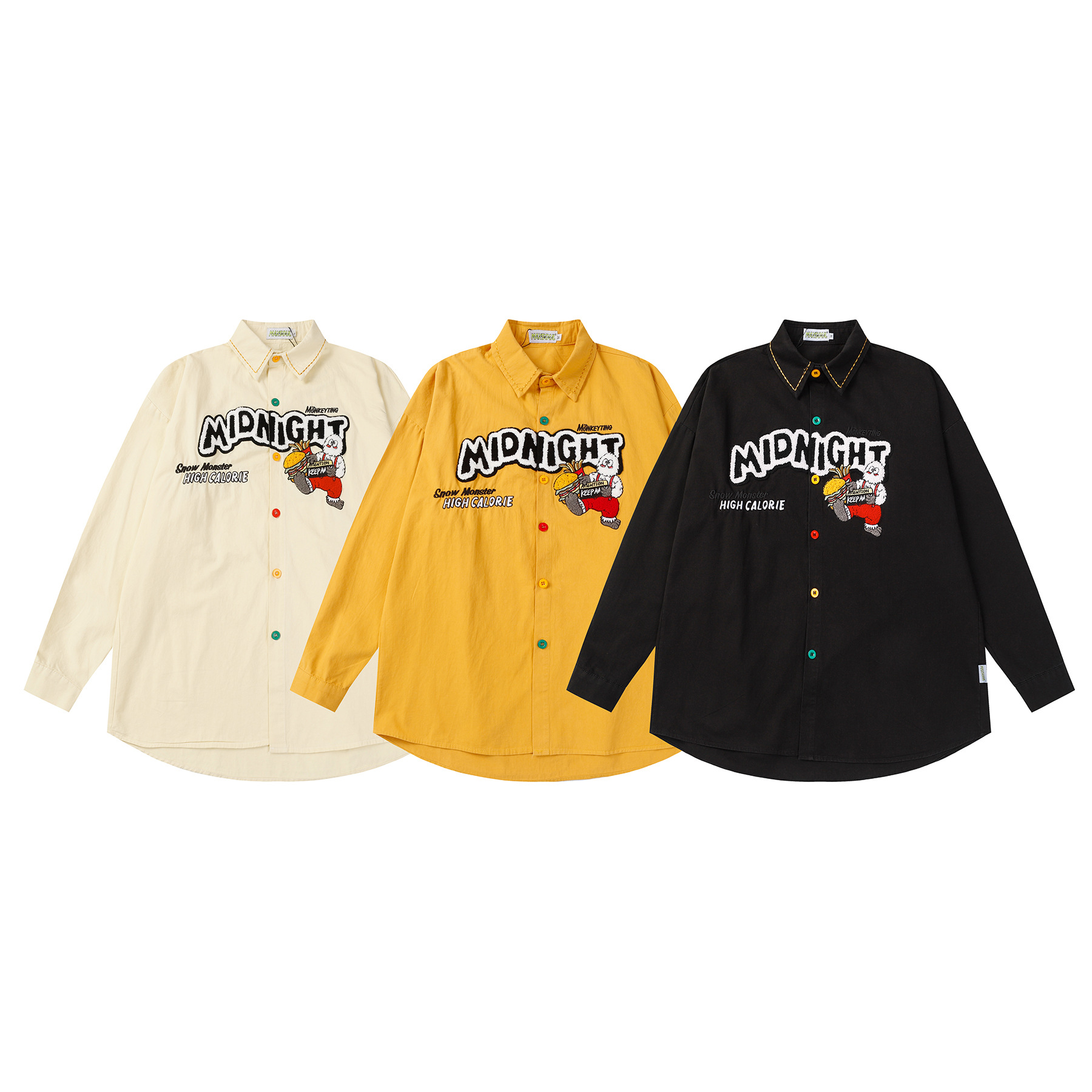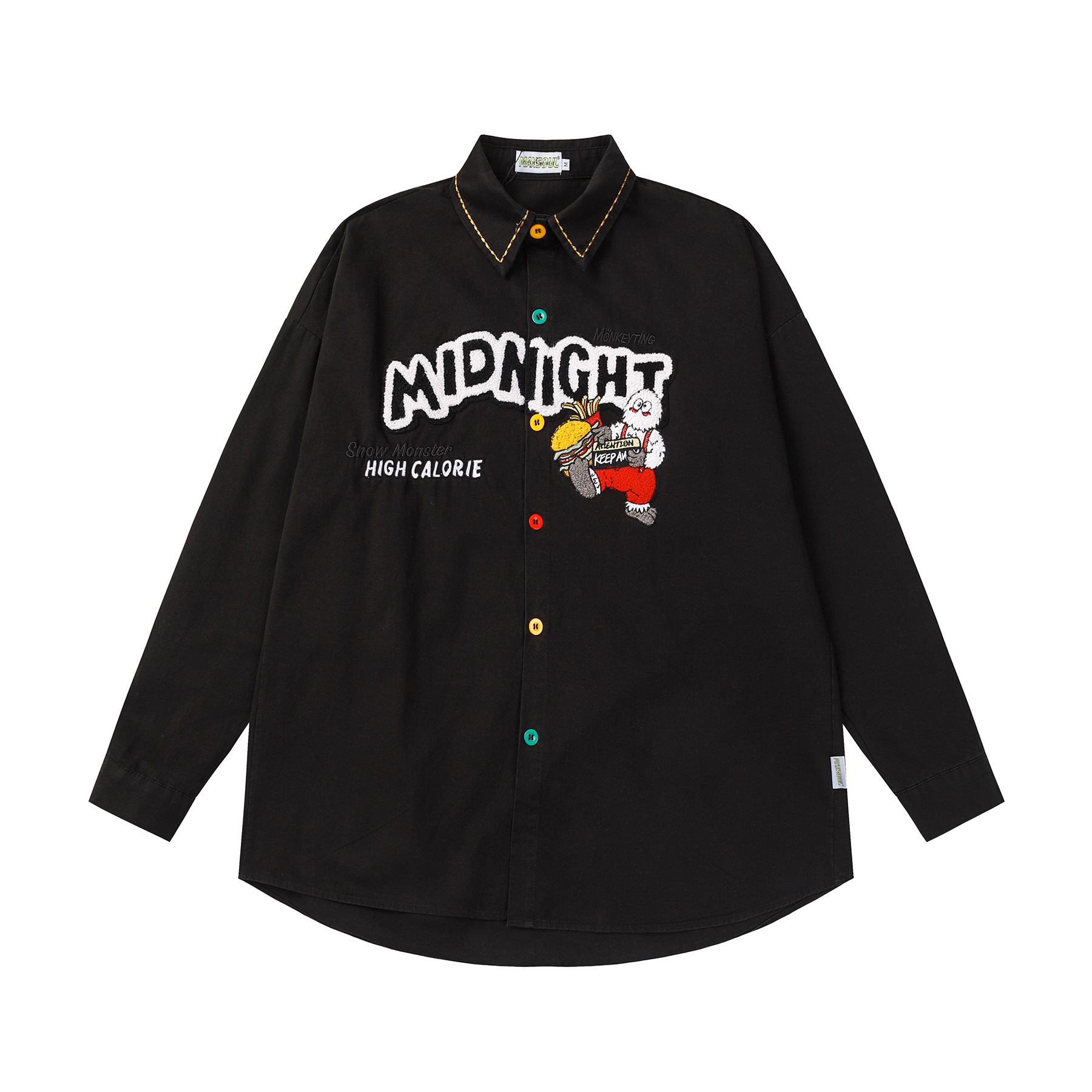 재미있는 디자인 수건 자수 만화 감자 튀김 햄버거 셔츠 거리 남녀 커플 오버 사이즈 긴팔 셔츠스토어 가기