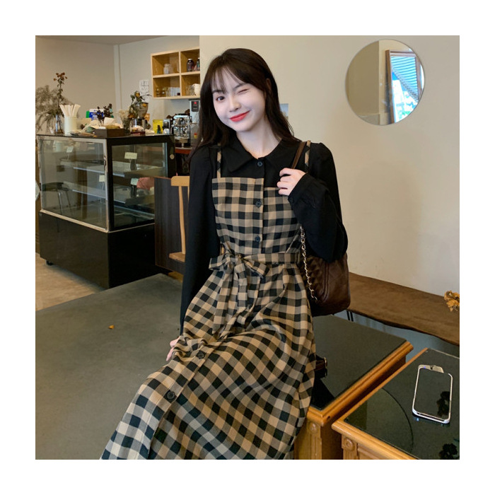 하이 엔드 레트로 페이크 투피스 플레이드 롱 원피스 여성 가을과 겨울 세련된 패션 올 매치 에이지 감소 셔츠 원피스스토어 가기