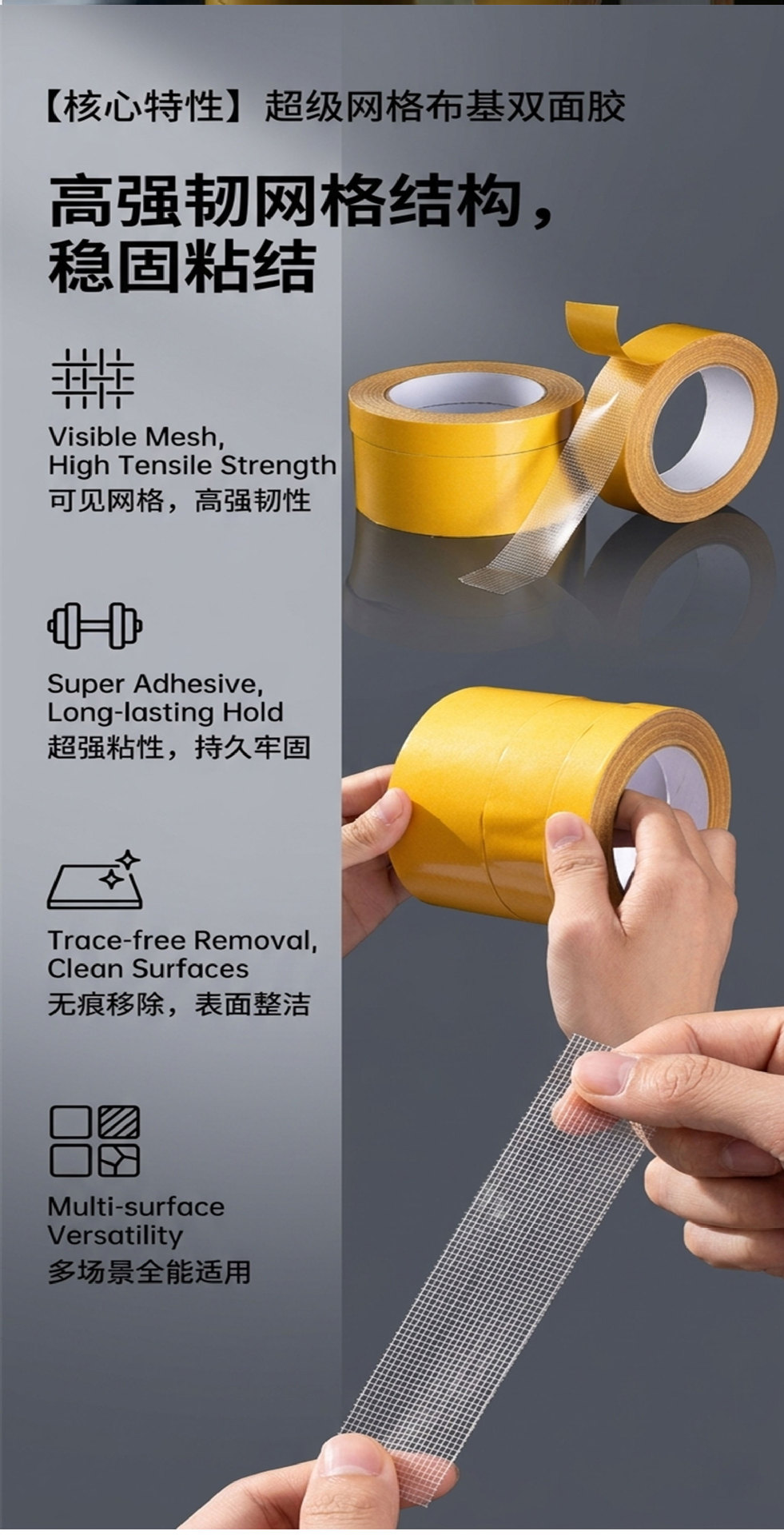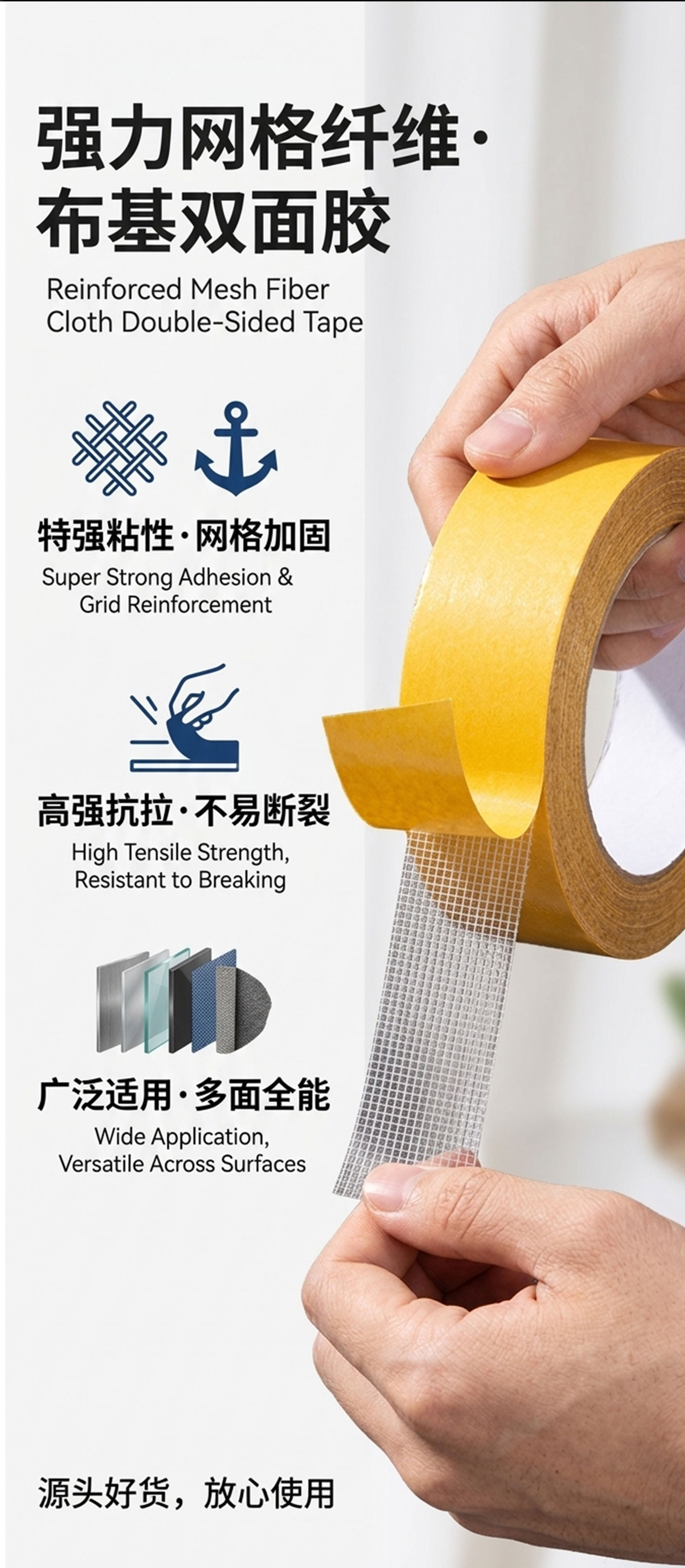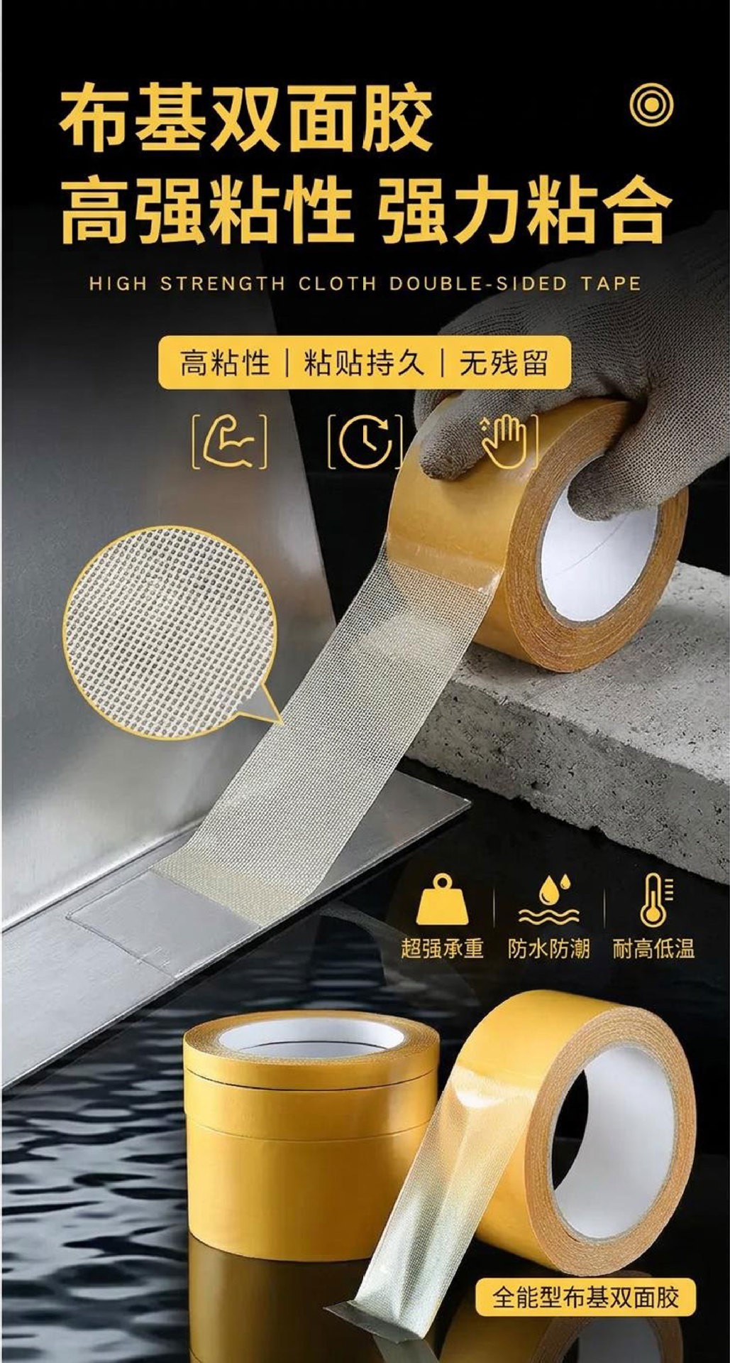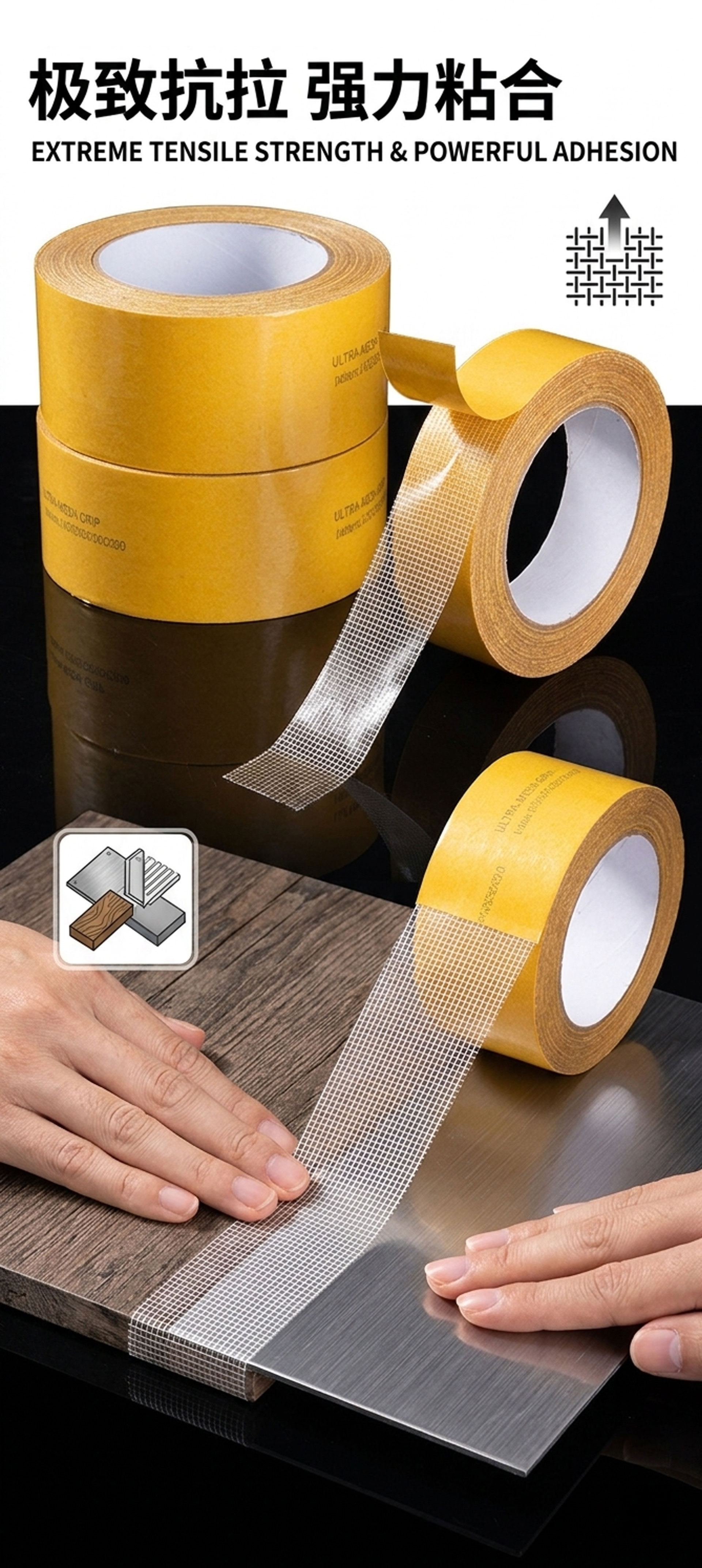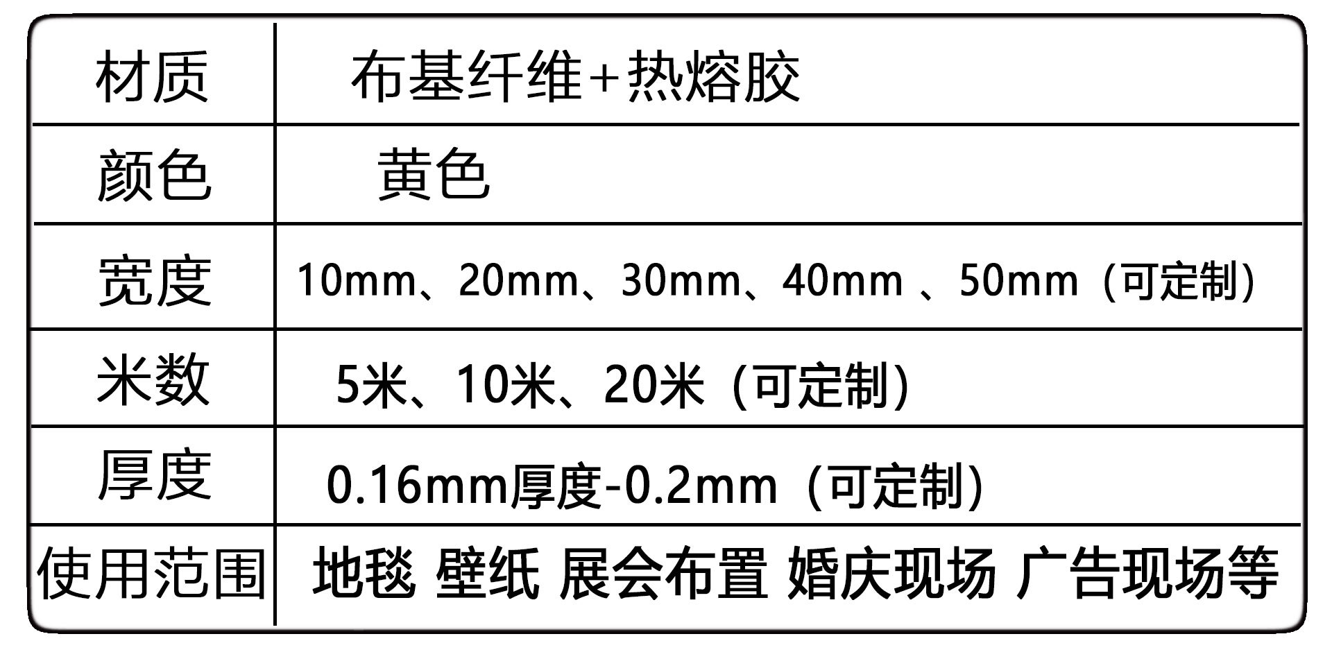 • 폭 50mm * 10 m 길이 (전체 상자 120 롤); 양면 직물 접착제