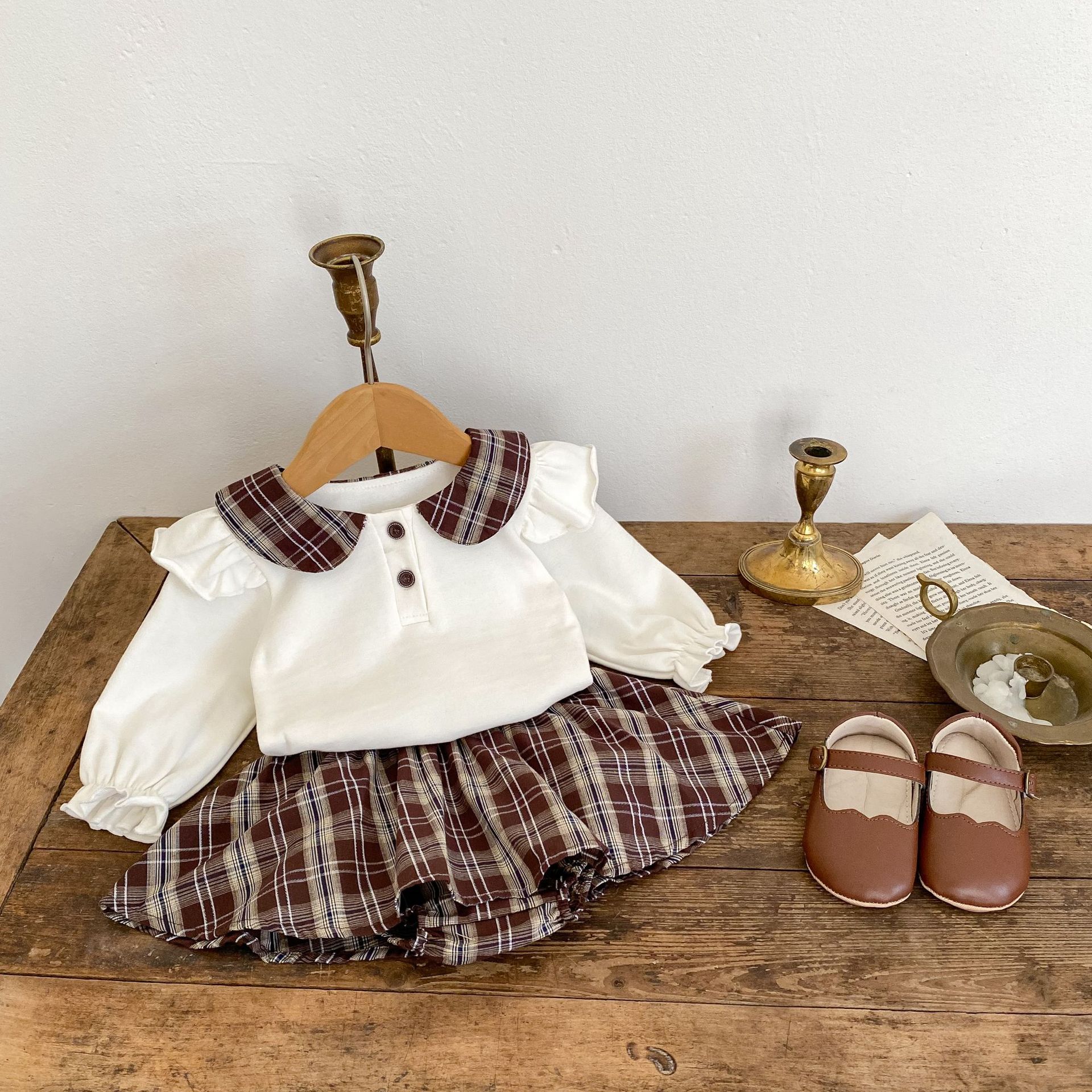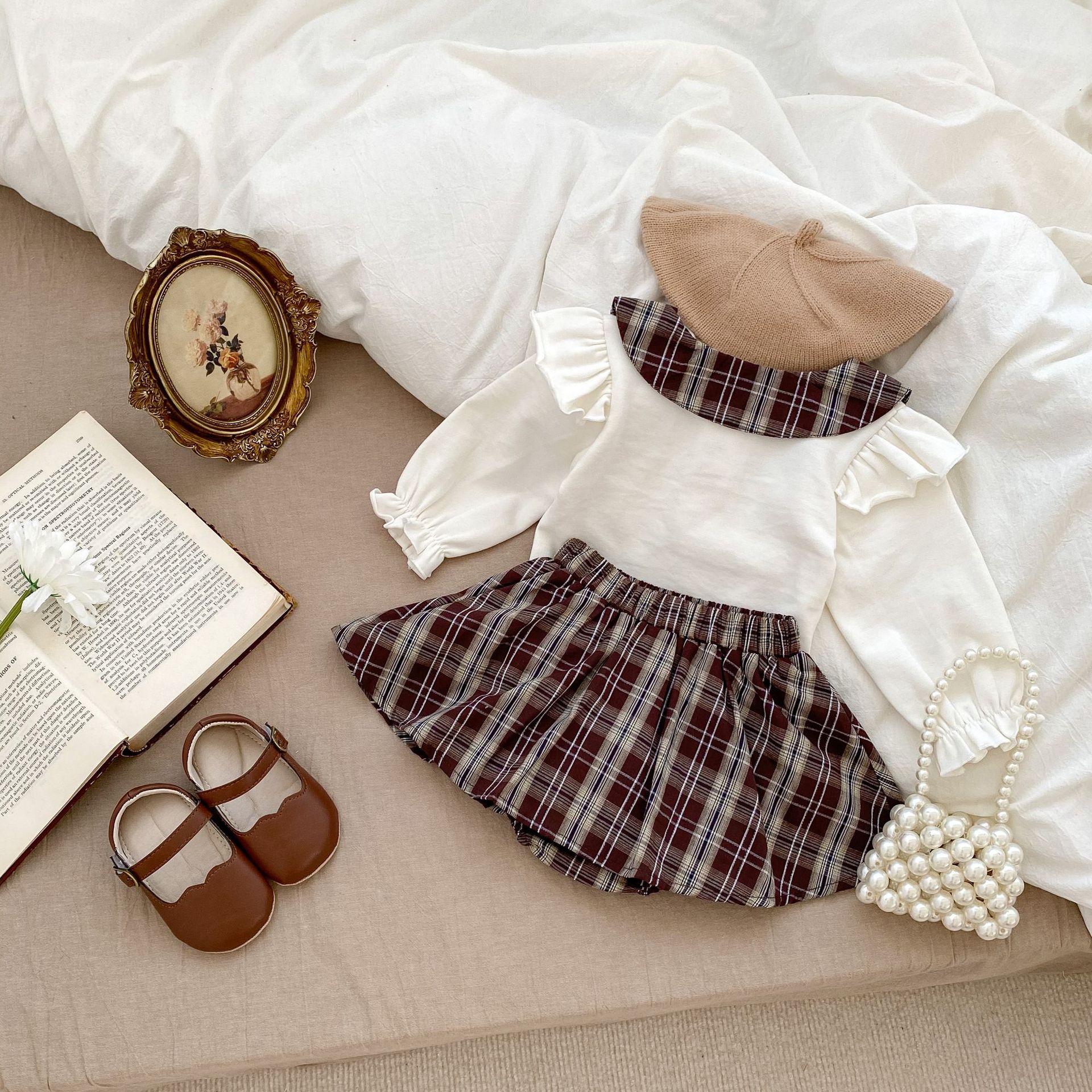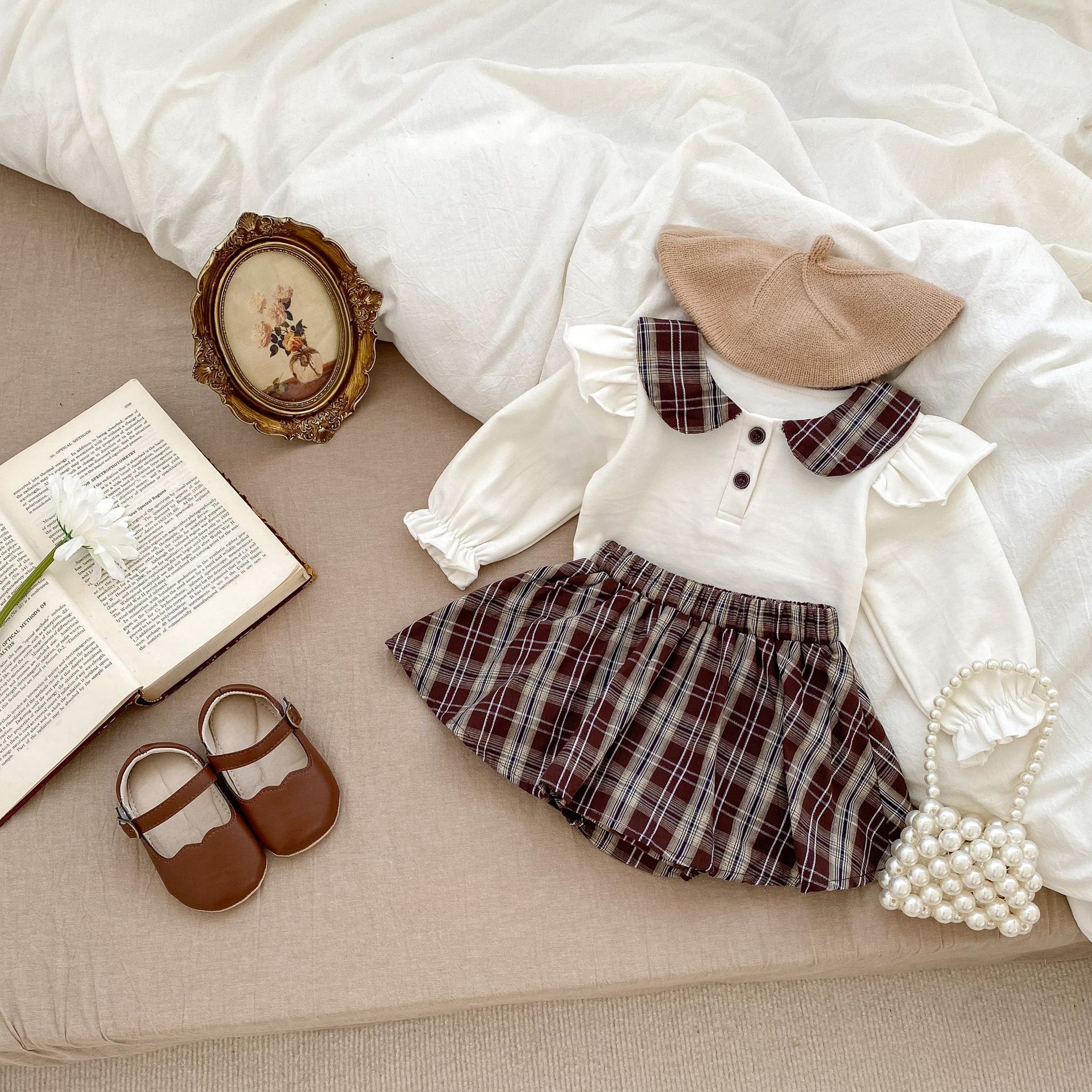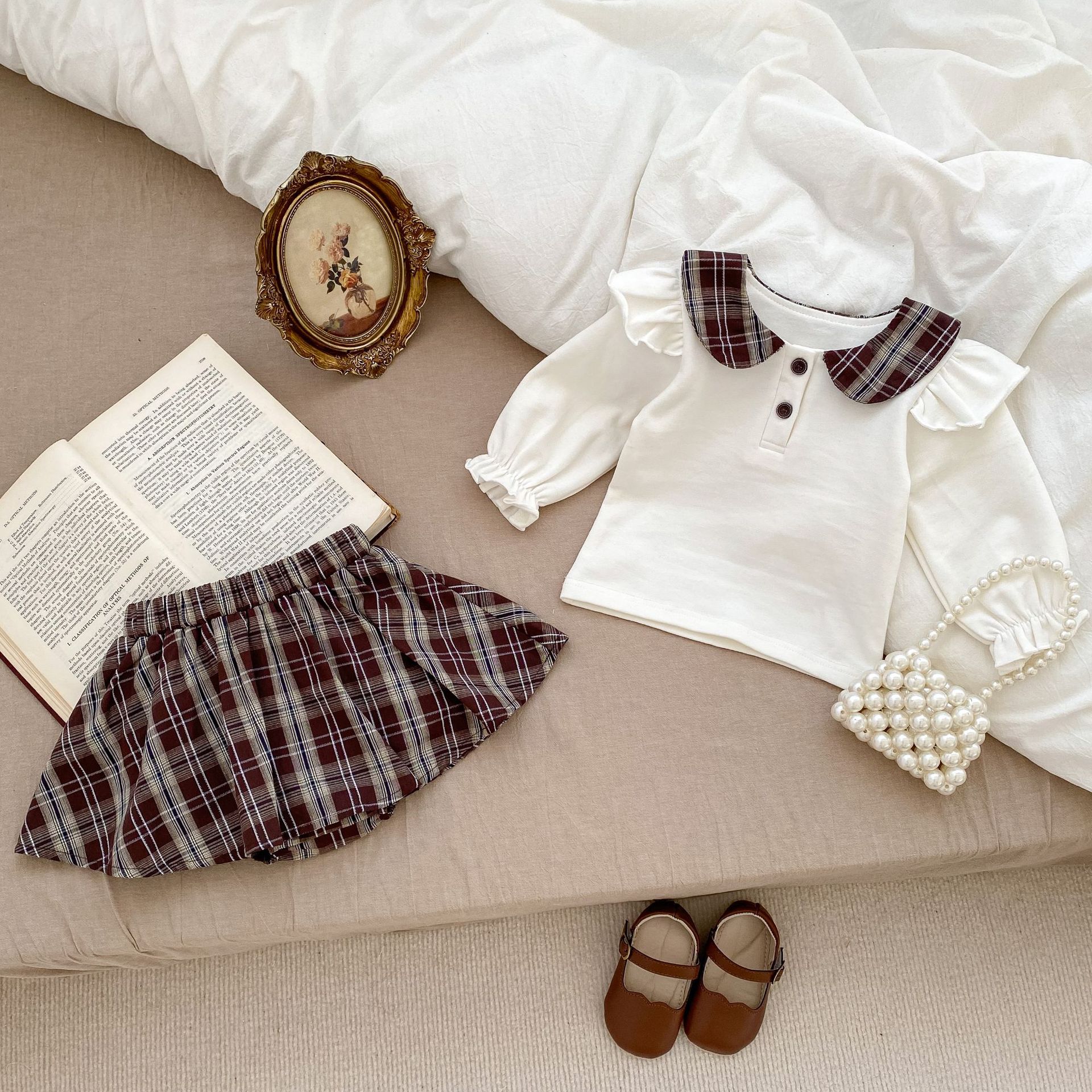 2025 봄 아기 소녀 달콤한 대학 스타일 정장 긴팔 라운드 넥 대비 색 티셔츠 격자 무늬 주름 가방 스커트 바지스토어 가기