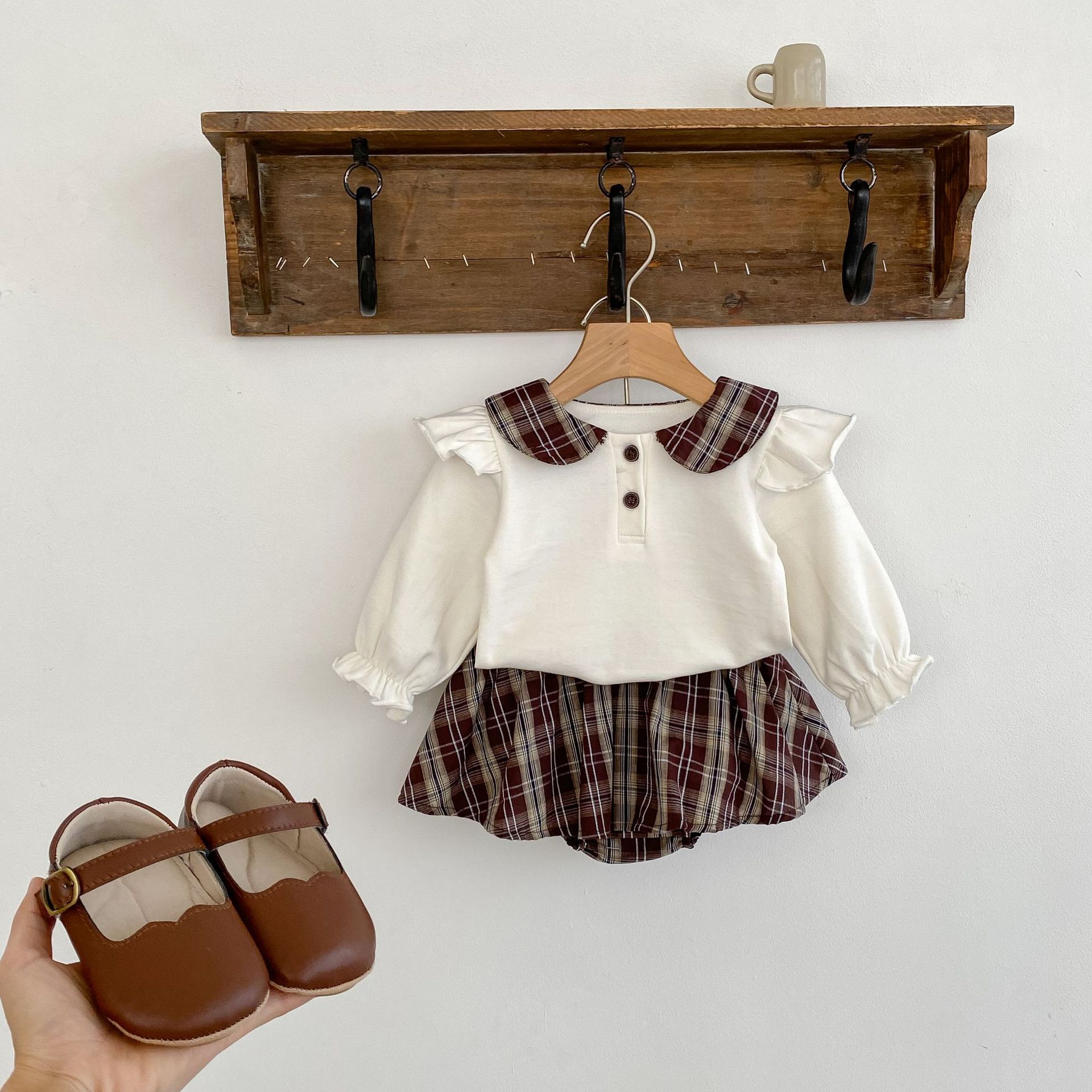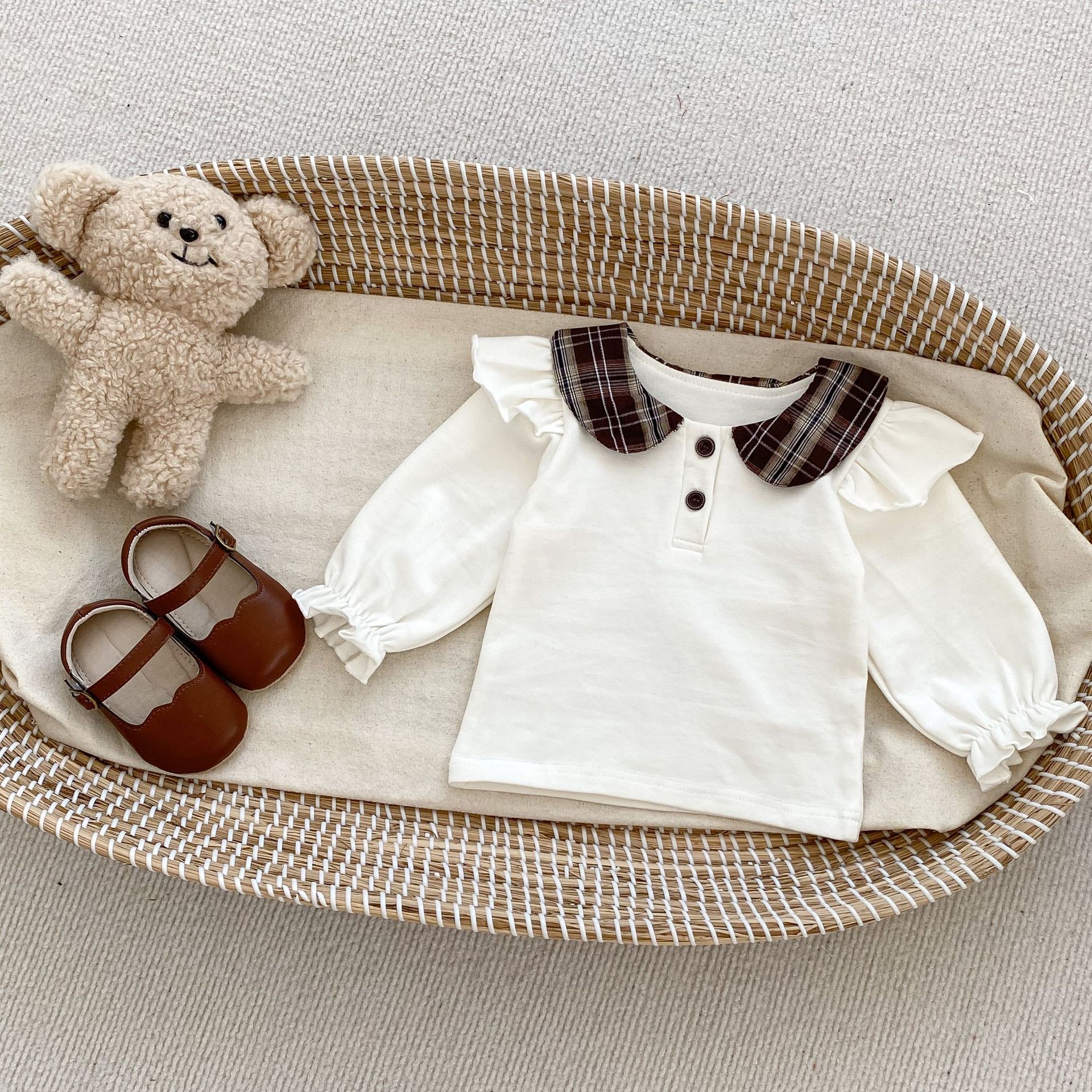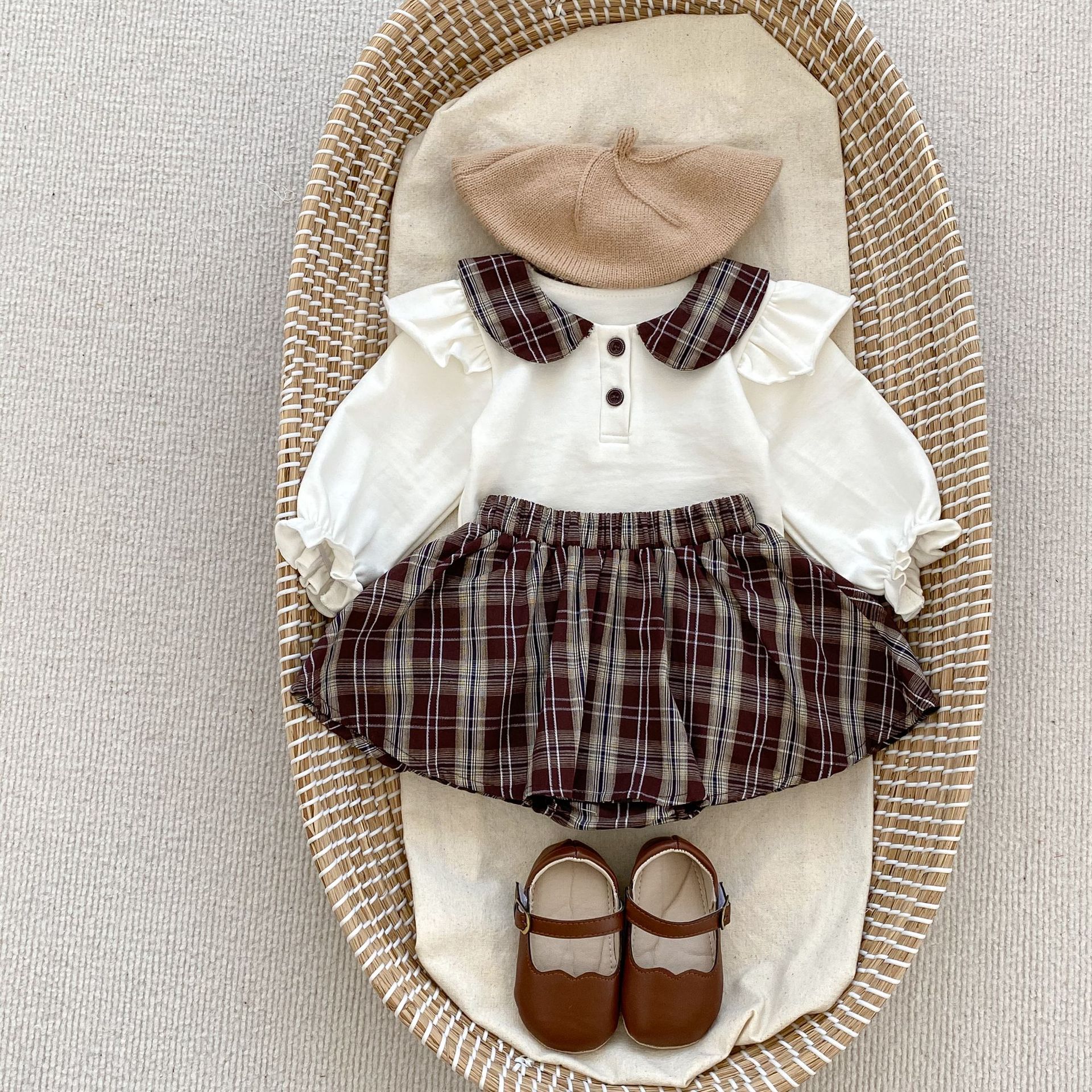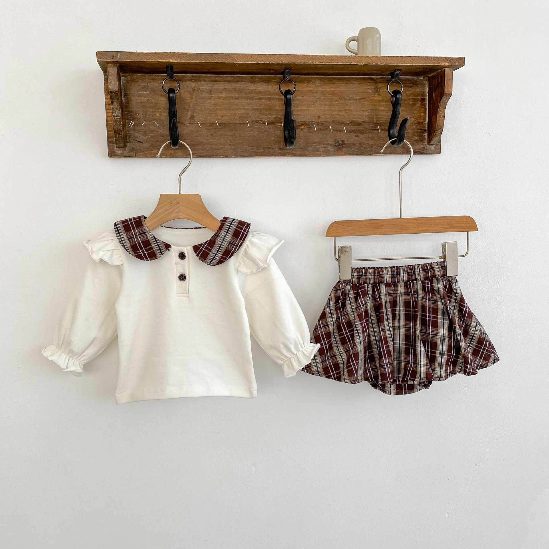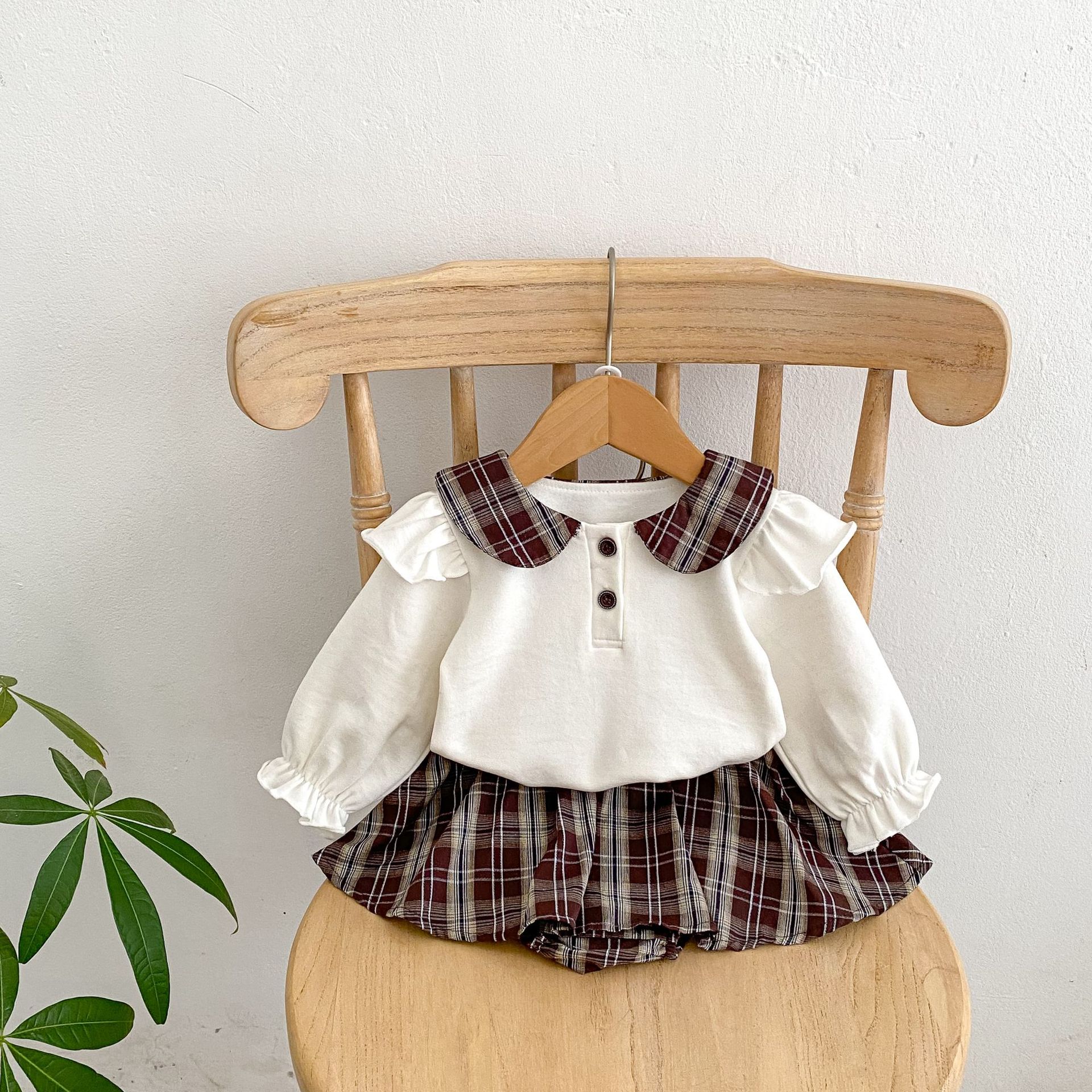 2025 봄 아기 소녀 달콤한 대학 스타일 정장 긴팔 라운드 넥 대비 색 티셔츠 격자 무늬 주름 가방 스커트 바지스토어 가기