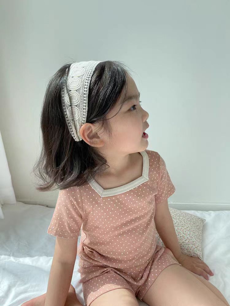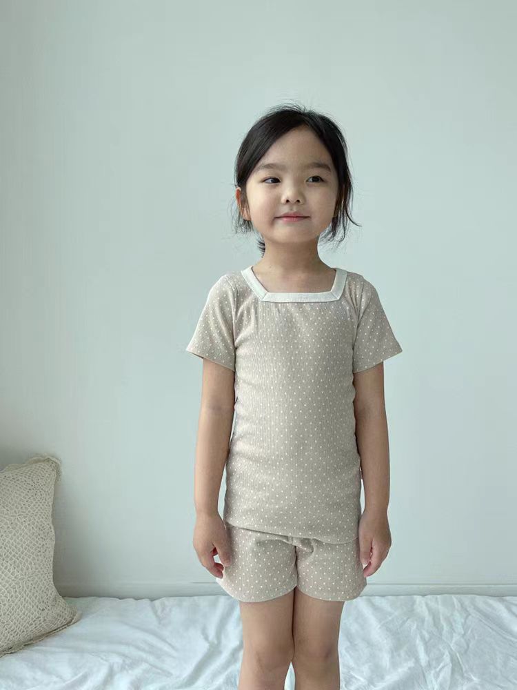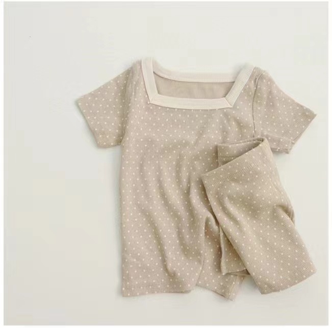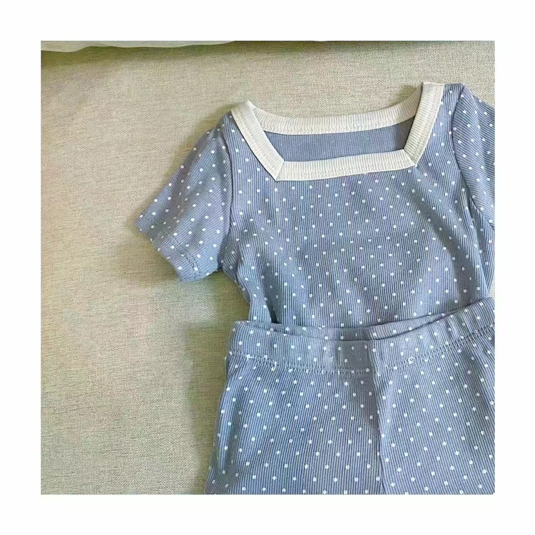 한국 스타일의 작은 점 가장자리 짧은 소매 반바지 다채로운 소년 소녀 아기 아기 의류 스퀘어 칼라 작은 복고풍 여름 세트스토어 가기