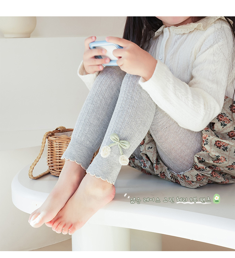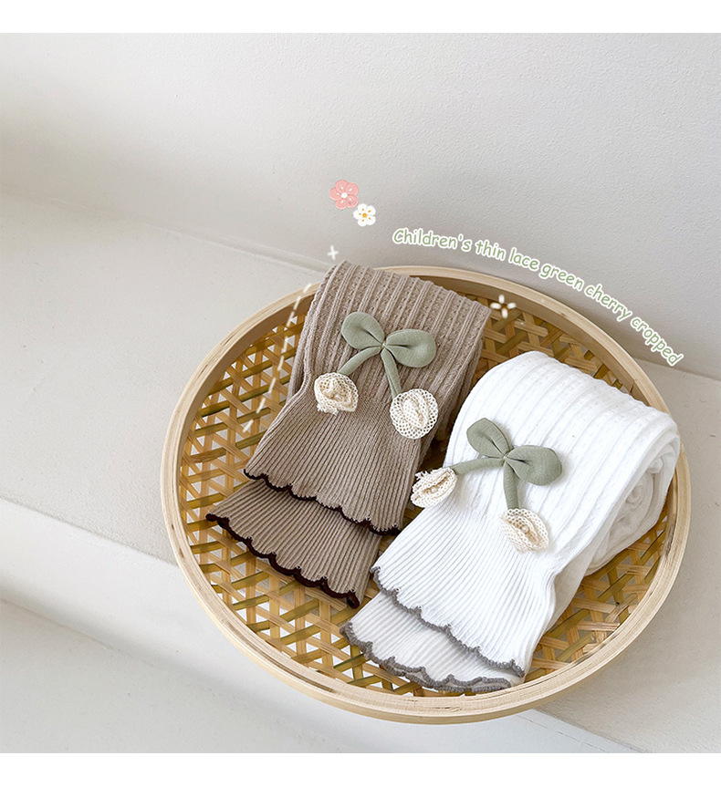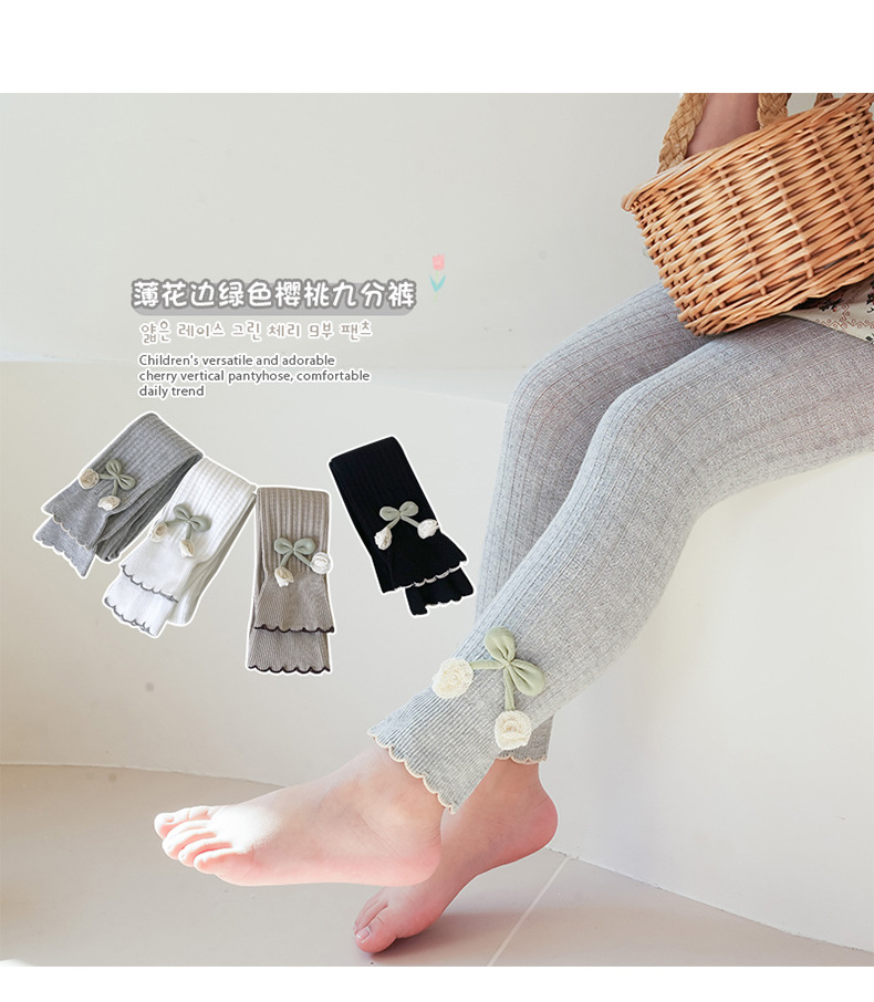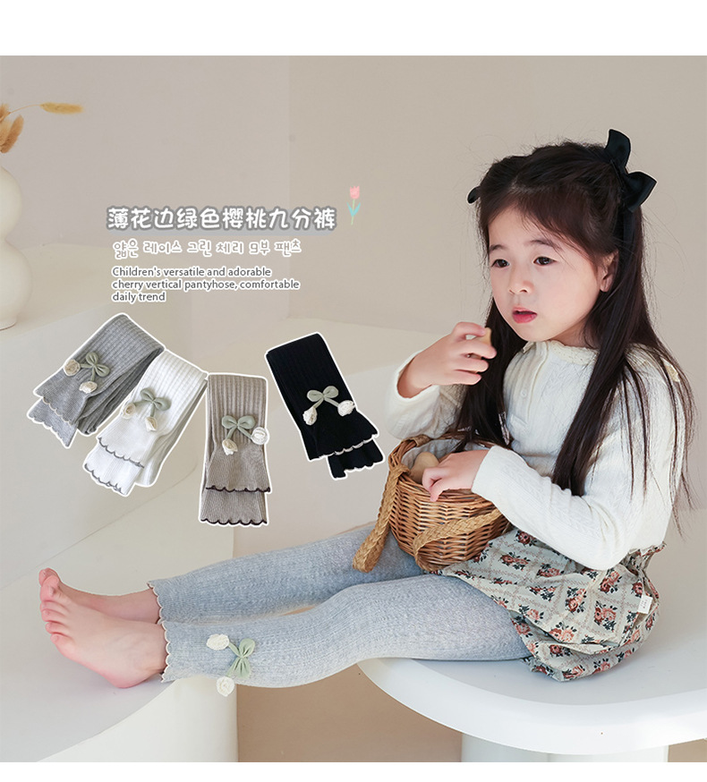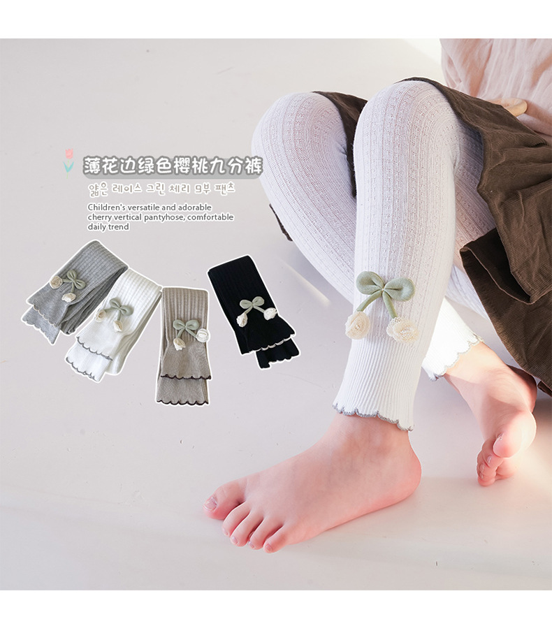 도매 소녀 봄과 가을 얇은 레깅스 겉옷 아동면 수직 줄무늬 레이스 녹색 체리 자른 바지