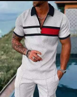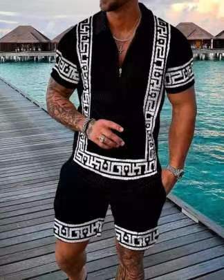 2024 여름 국경 아마존 독립 역 새로운 줄무늬 디지털 인쇄 폴로 세트 캐주얼 세트 남성