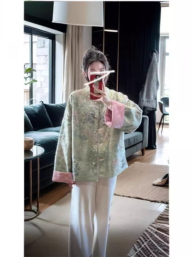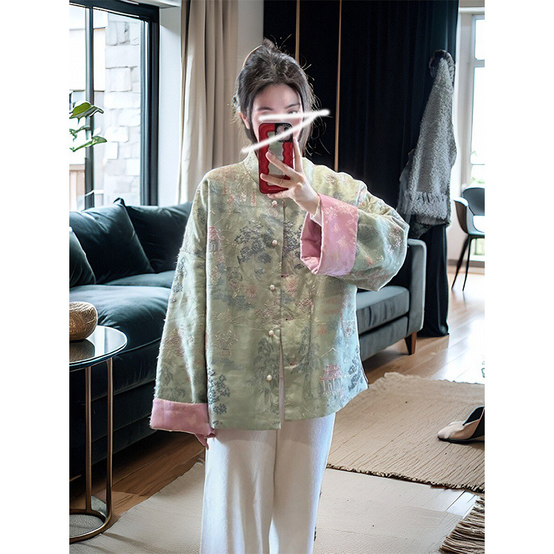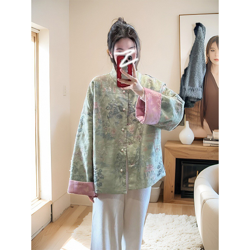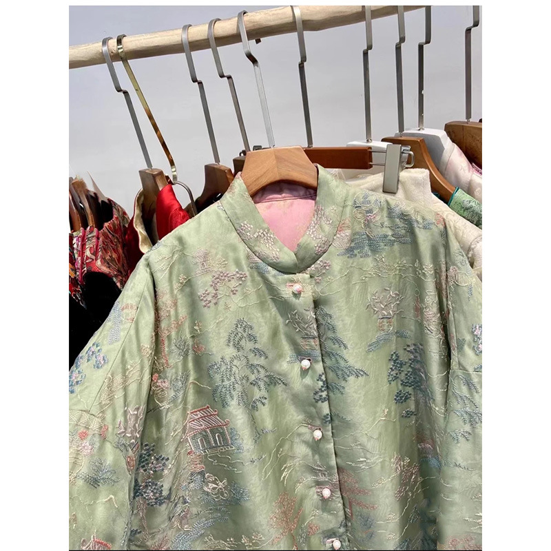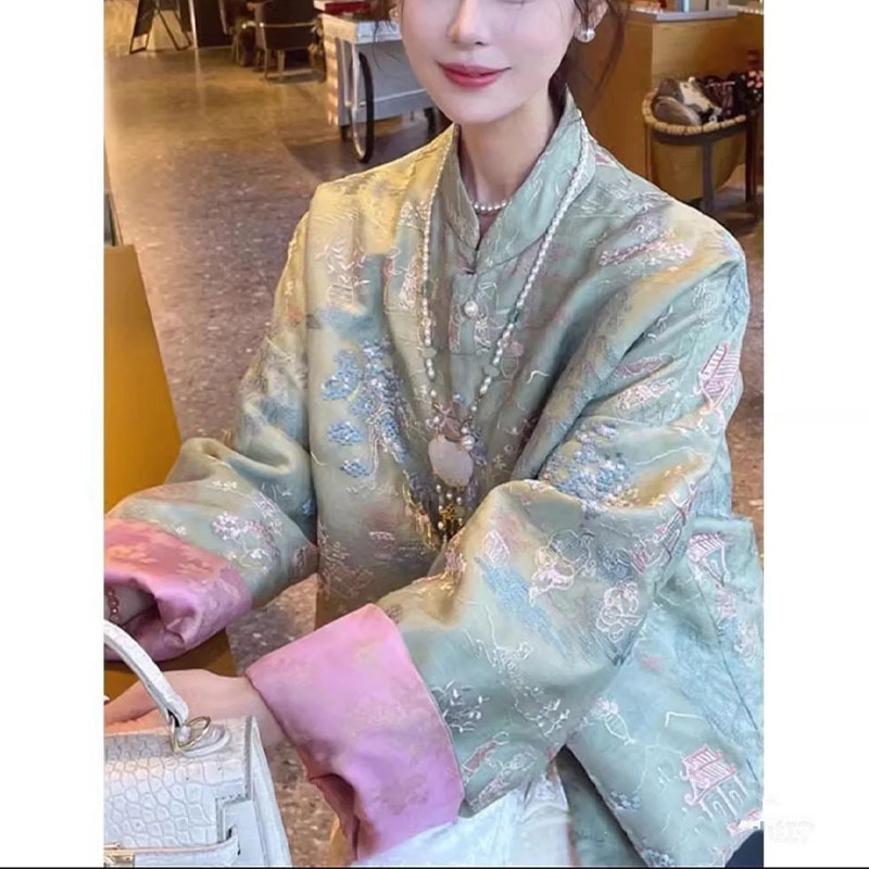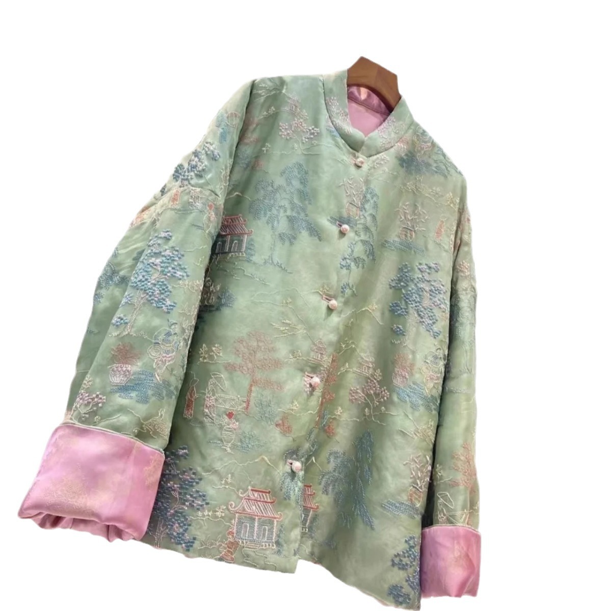 재고 새로운 중국 요정 2024 이른 봄 중공업 파빌리온 파빌리온 자수 진주 버클 양면 대비 컬러 코트스토어 가기