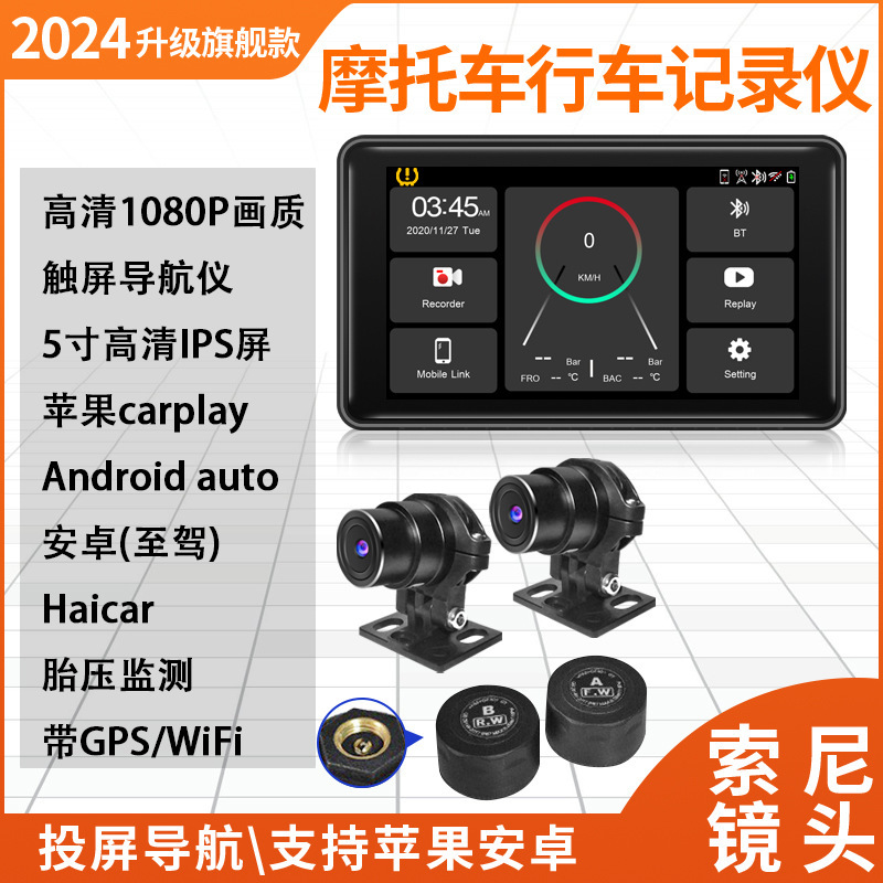 오토바이 운전 레코더 카플레이 프로젝션 스크린 내비게이션 1080p 타이어 압력 감지 방수 5 인치 대형 스크린 녹화스토어 가기