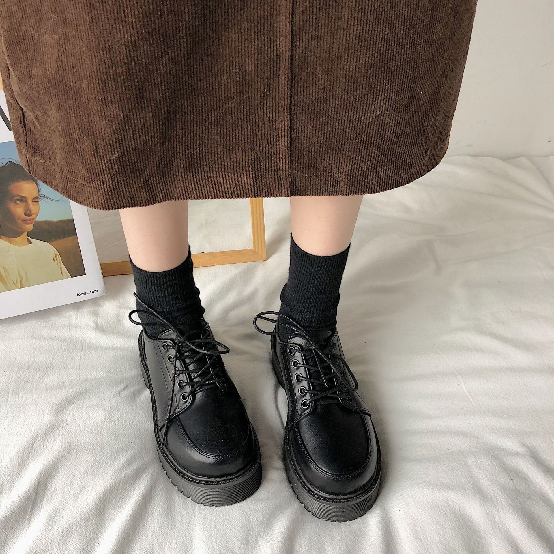 여성을위한 영국 스타일 천 라운드 발가락 신발 2025 새로운 두꺼운 밑창 플랫폼 앞 레이스 유니폼 jk 작은 가죽 신발 여성 도매스토어 가기