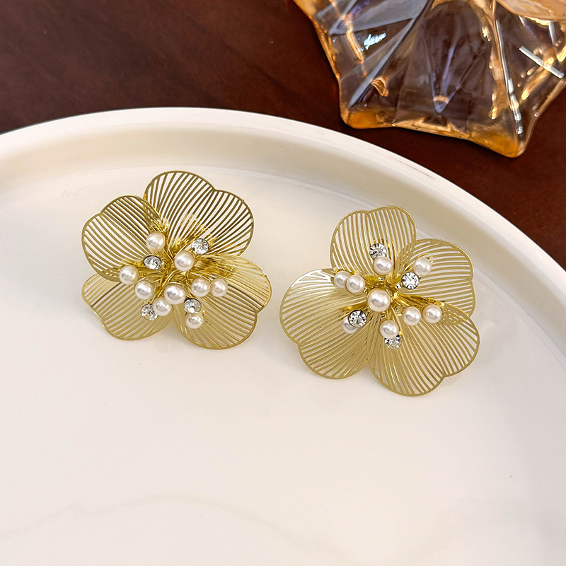 일본과 한국식 금속 꽃 진주 귀걸이 달콤한 시원한 개성 스파클링 다이아몬드 귀걸이 여성을위한 가벼운 고급 우아한 하이 엔드 귀걸이