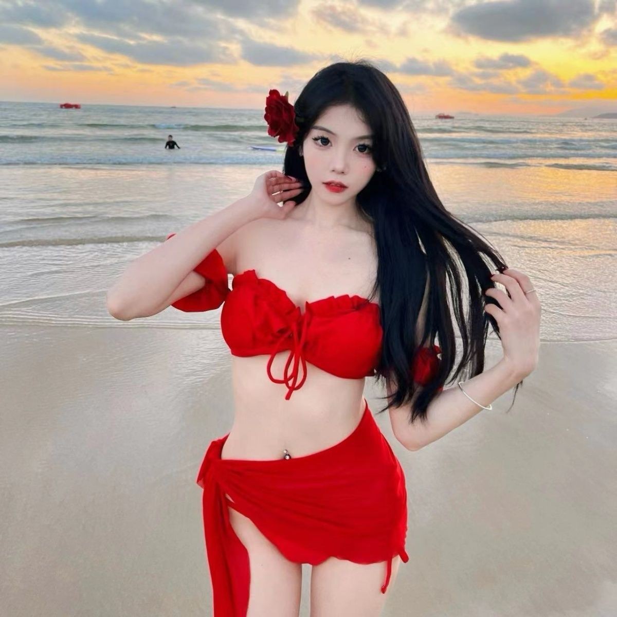 Mosricci 순수한 욕망 밝은 빨간색 흰색 섹시한 비키니 3 피스 투피스 수영복 여성의 긴 소매 고기 커버 휴가스토어 가기
