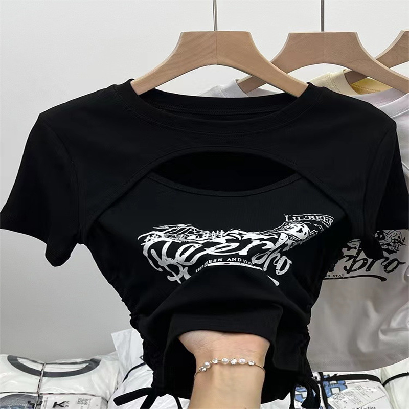 여자 여름 새 티셔츠 2025 한국어 문자 양쪽 Drawstring 짧은 중공 반팔 라운드 넥 티셔츠 바닥 셔츠스토어 가기