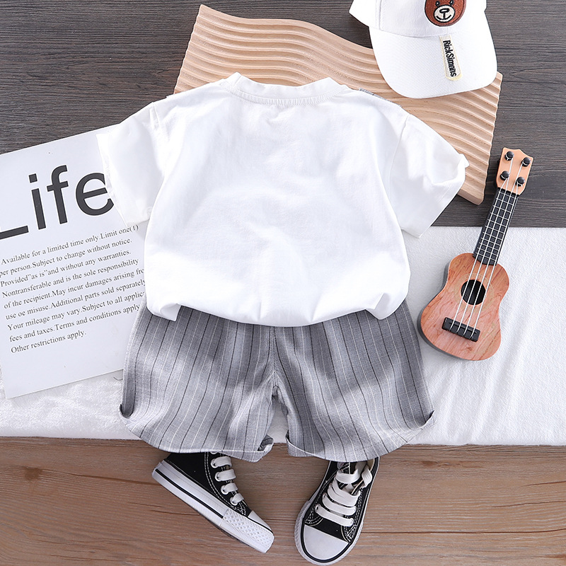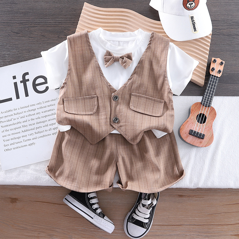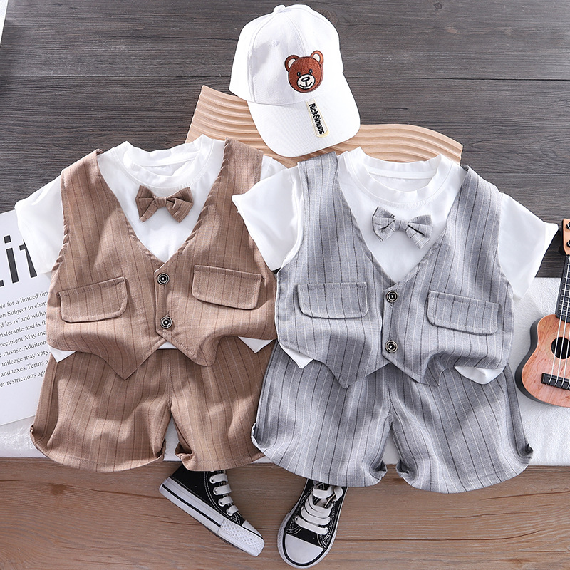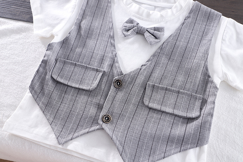 도매 아동복 LQ 나비 넥타이 잘 생긴 격자 무늬 세트 가짜 투피스 반팔 탑 2024 여름 새로운 어린이 세트
