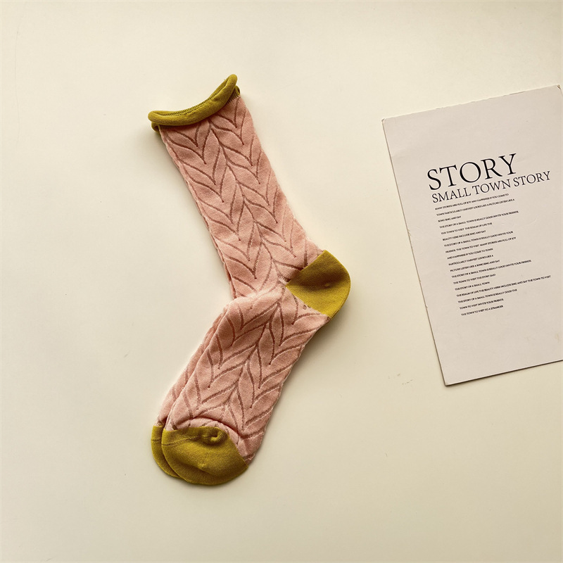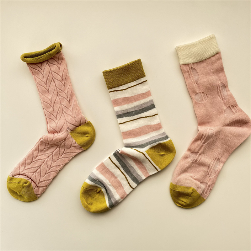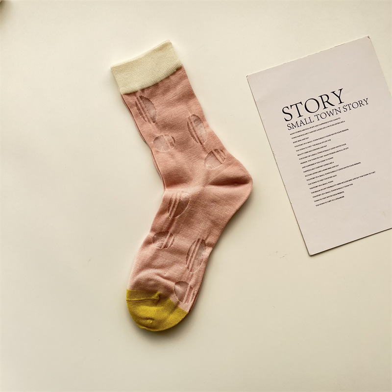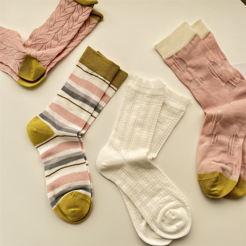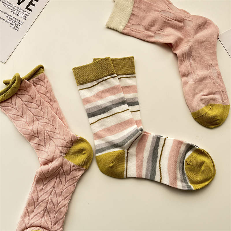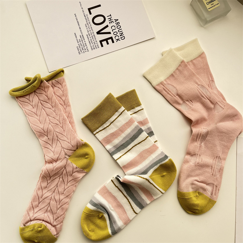 봄과 여름 핑크 얇은 중공 대형 라운드 양말 여성의 일본 복고풍 줄무늬 중반 종아리 양말 컬링 메쉬 여성용 양말