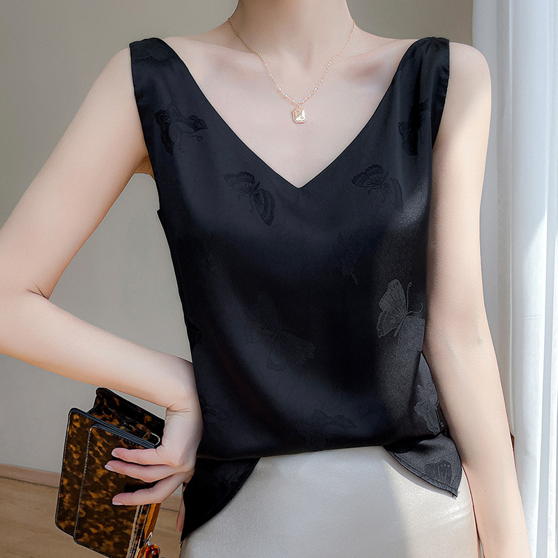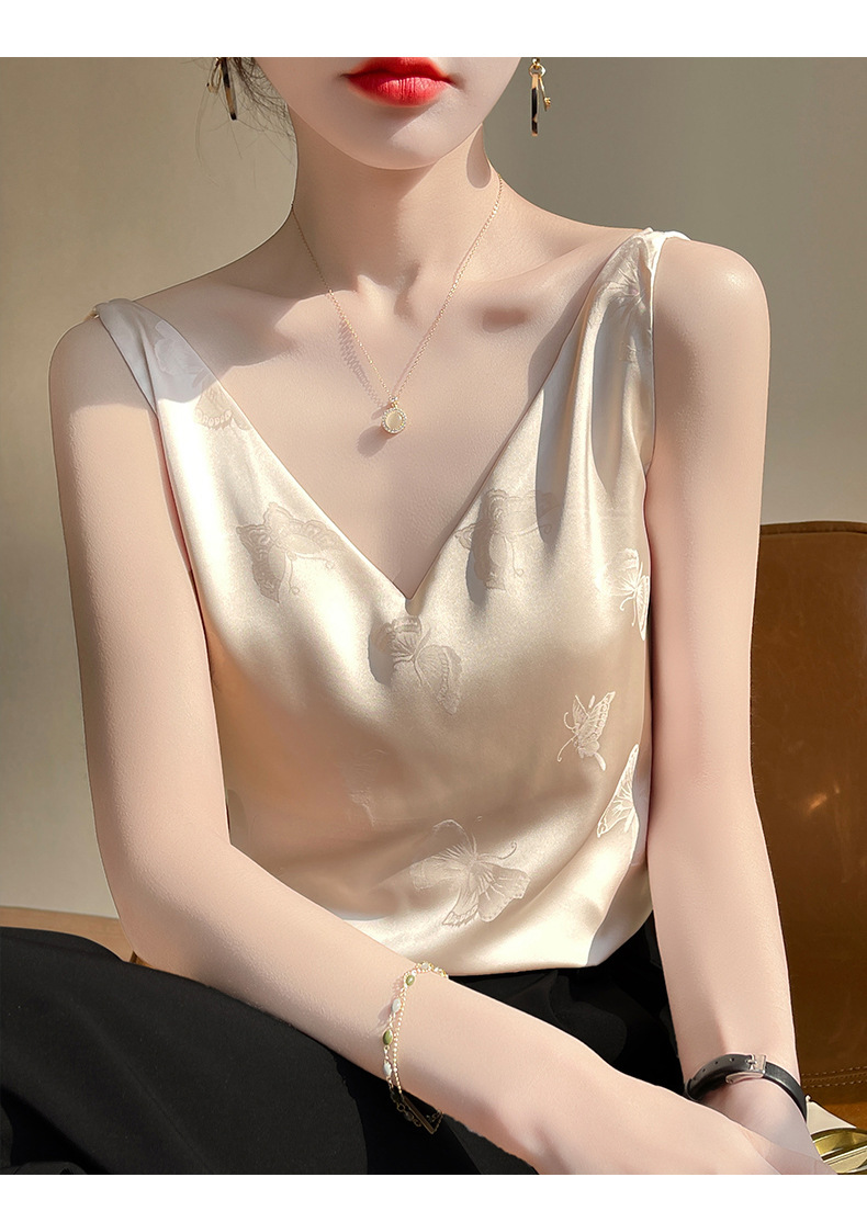 고급 엠보싱 실크 조끼 여성용 겉옷 짧은 느슨한 민소매 아름다운 작은 셔츠 백리스 슬링 사교계 탑