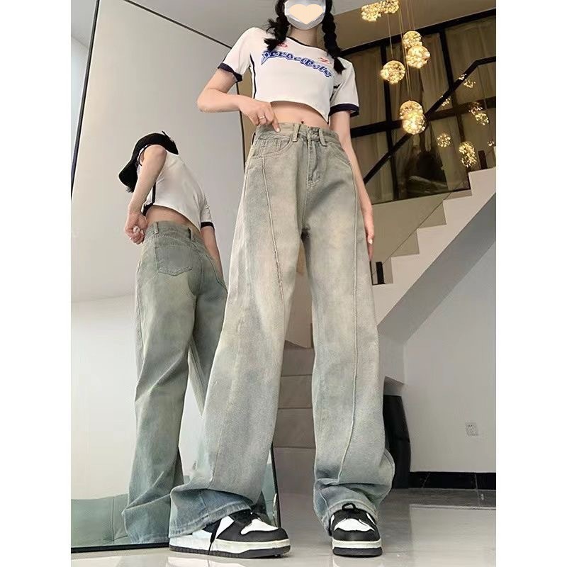 스트레이트 청바지 여성의 여름 높은 허리 슬리밍 작은 좁은 걸레 바지 디자인 노란색 진흙 넓은 다리 바지스토어 가기