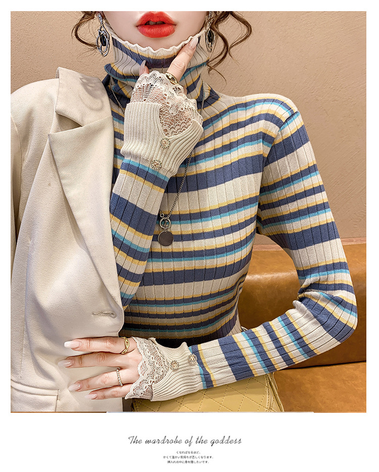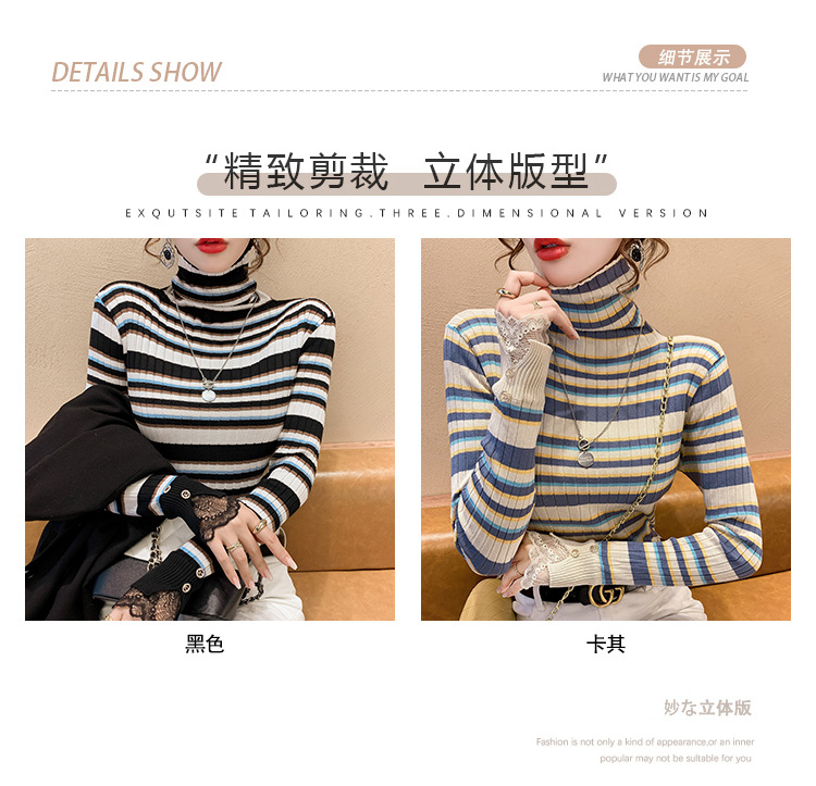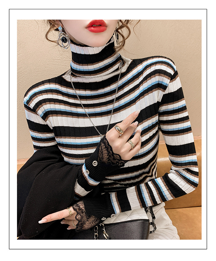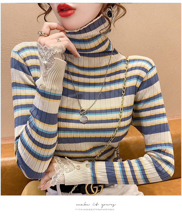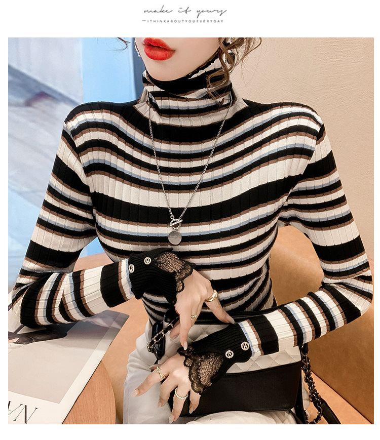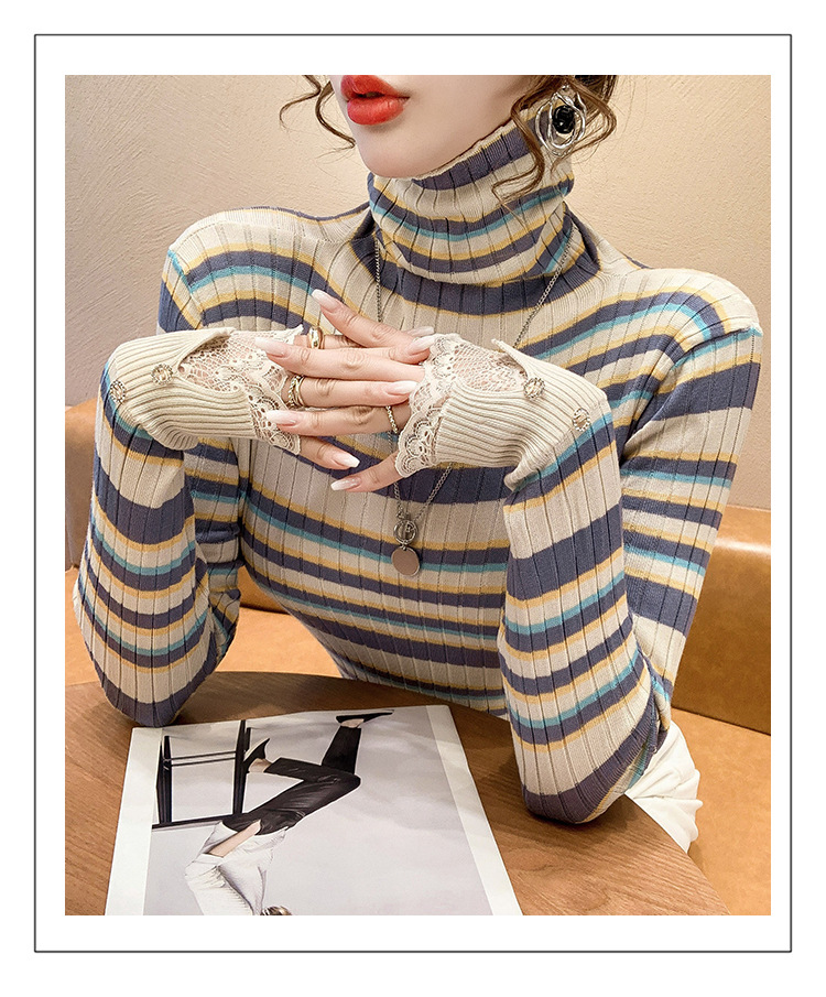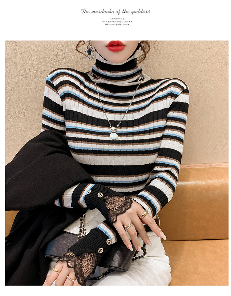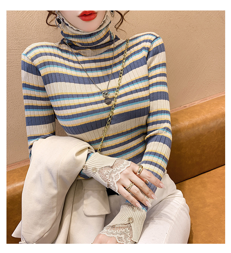 터틀넥 스트라이프 스웨터 니트 바닥 셔츠 여성용 내복 가을과 겨울 웨스턴 스타일 레이스 스티칭 긴 소매 세련된 탑 인