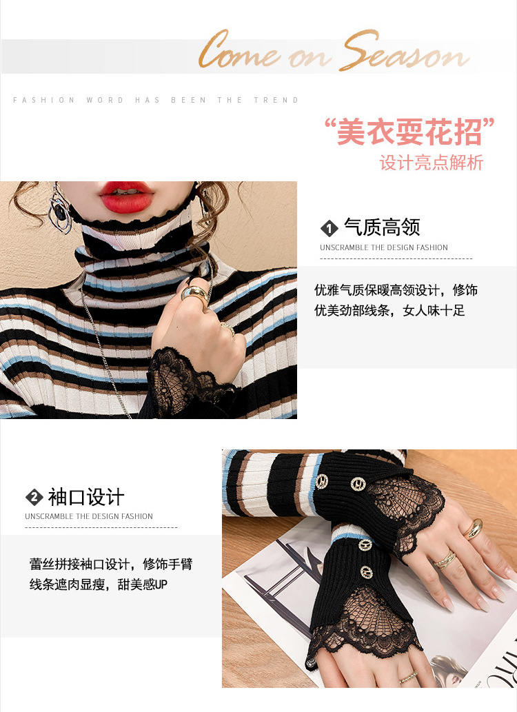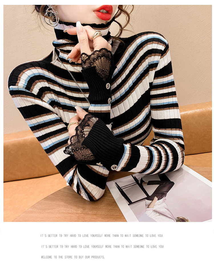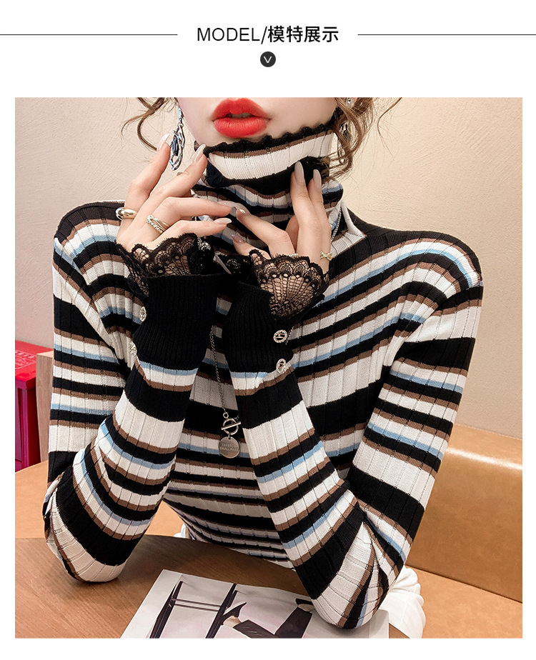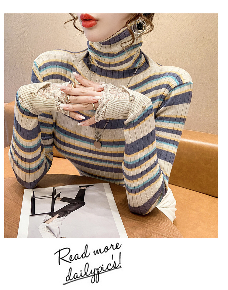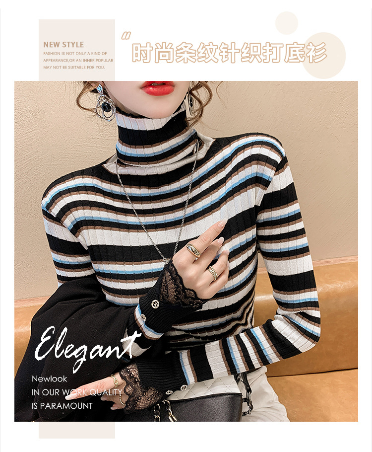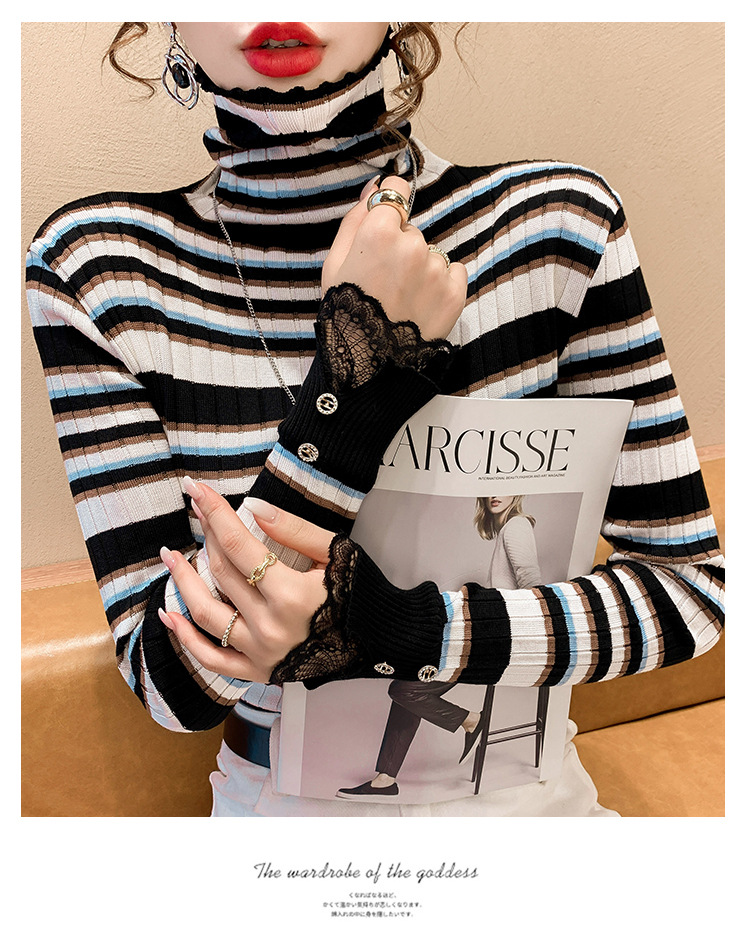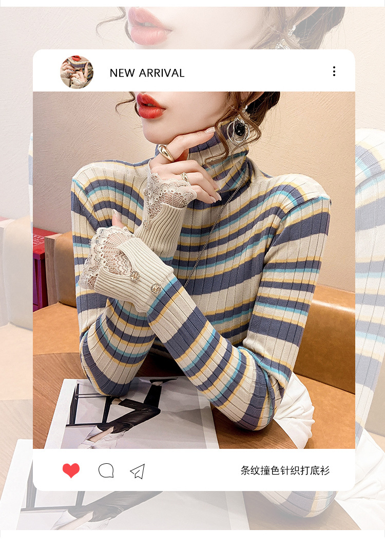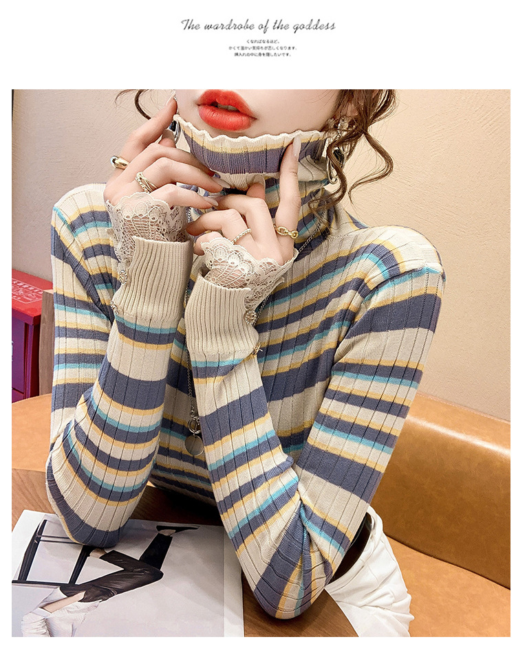터틀넥 스트라이프 스웨터 니트 바닥 셔츠 여성용 내복 가을과 겨울 웨스턴 스타일 레이스 스티칭 긴 소매 세련된 탑 인스토어 가기