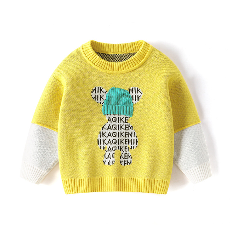 봄 2024 소년 풀오버 스웨터 도매 아기 한국 스타일 대비 컬러 소매 원피스 스웨터 더블 레이어 라운드 넥 스웨터