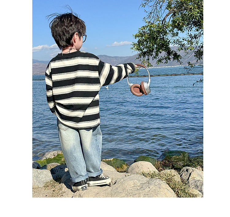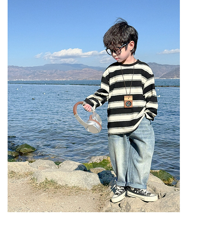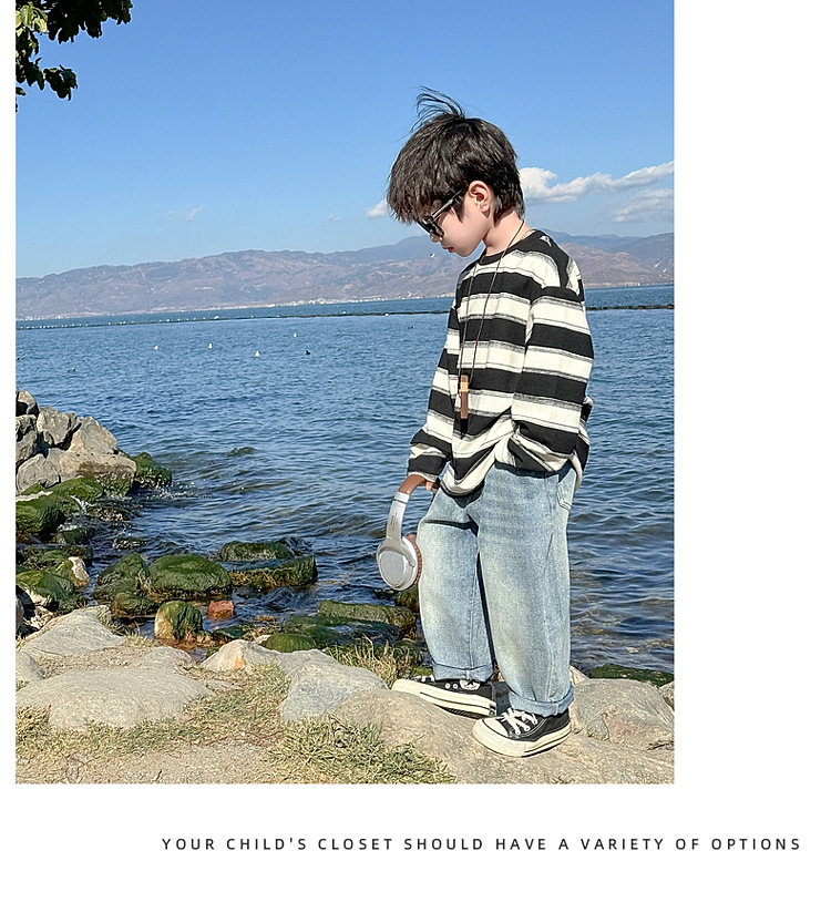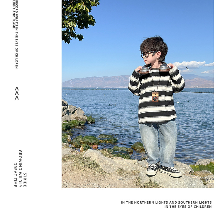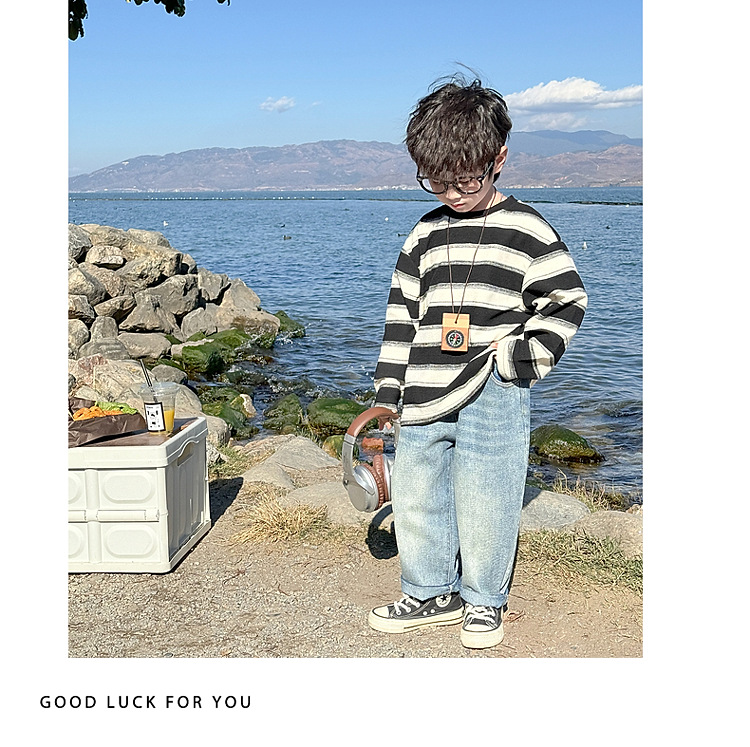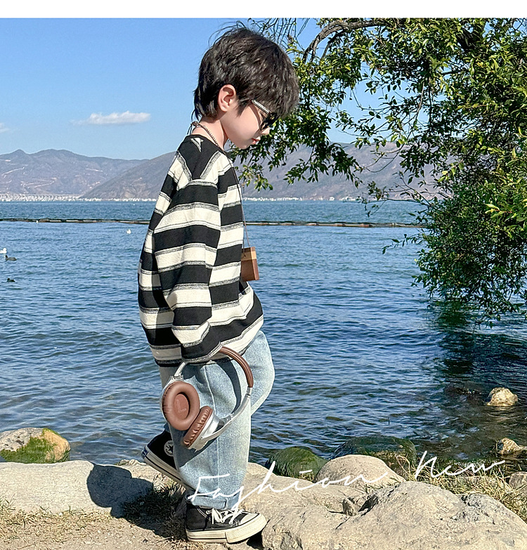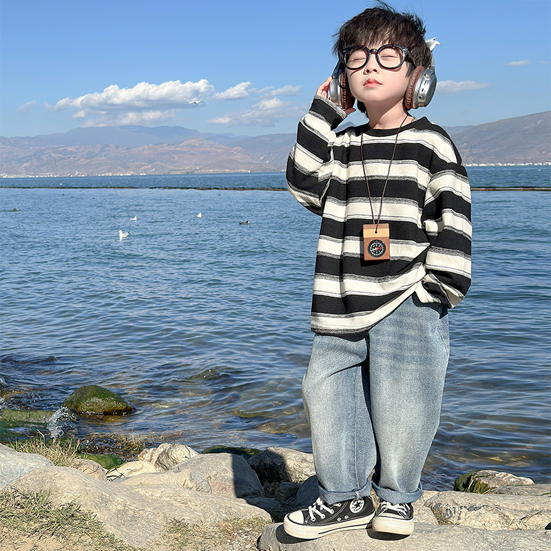 소년 봄 긴팔 티셔츠는 새로운 어린이 봄과 가을 줄무늬 셔츠 소년 봄면 탑을 2024