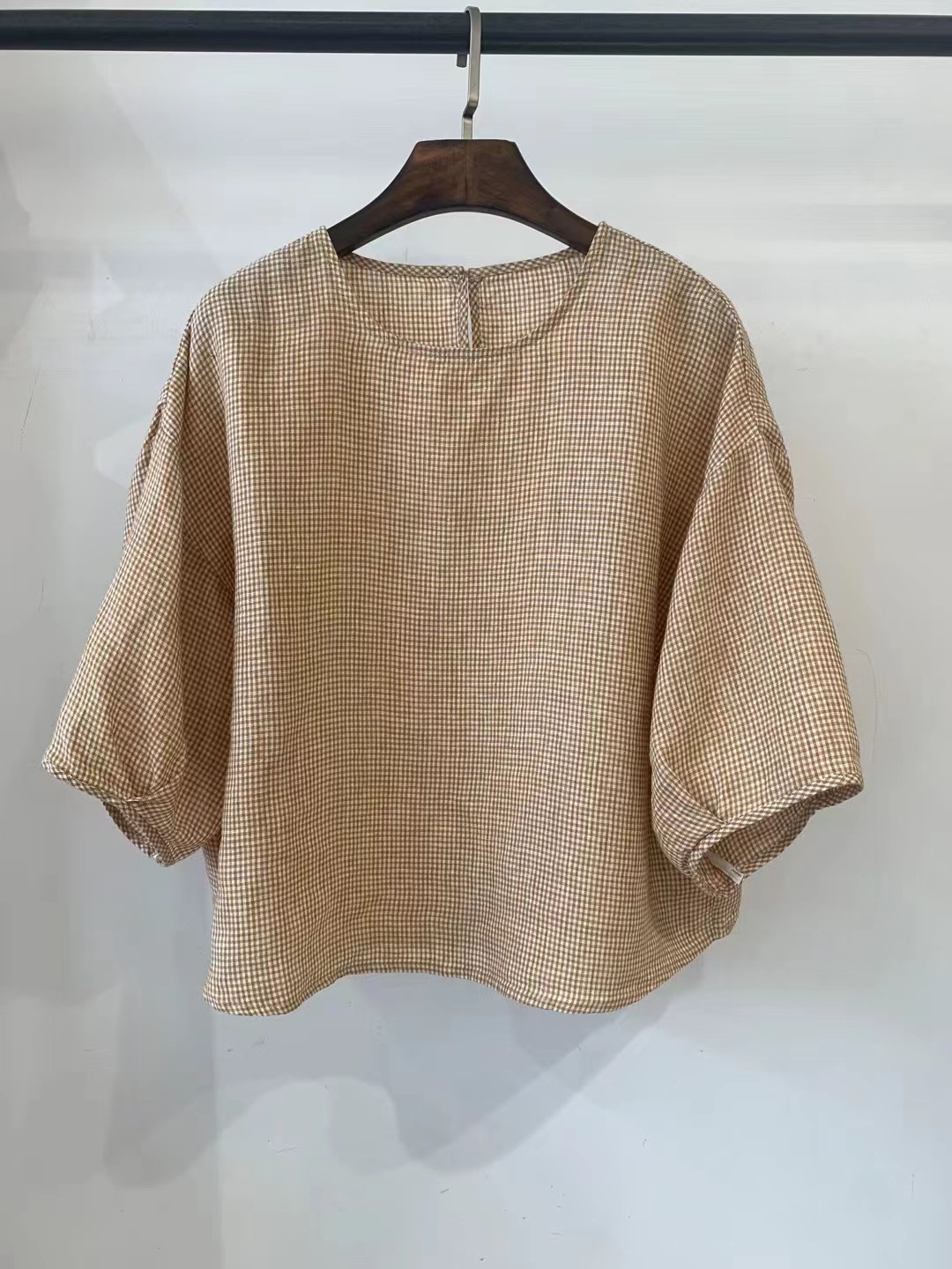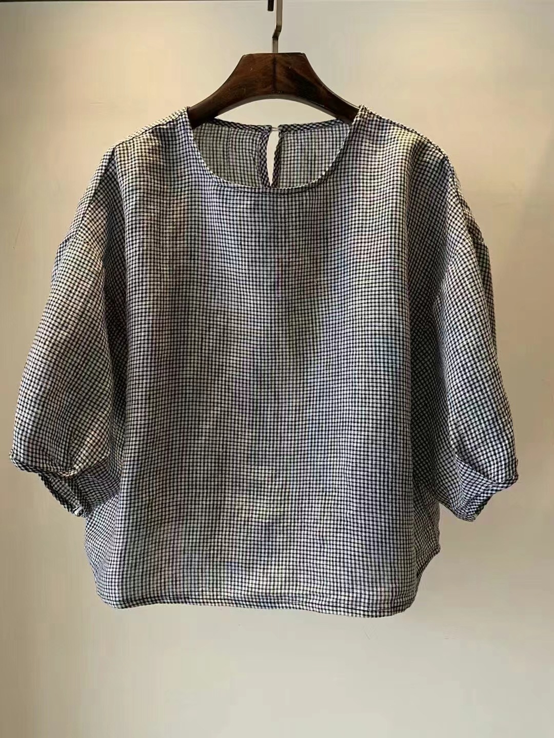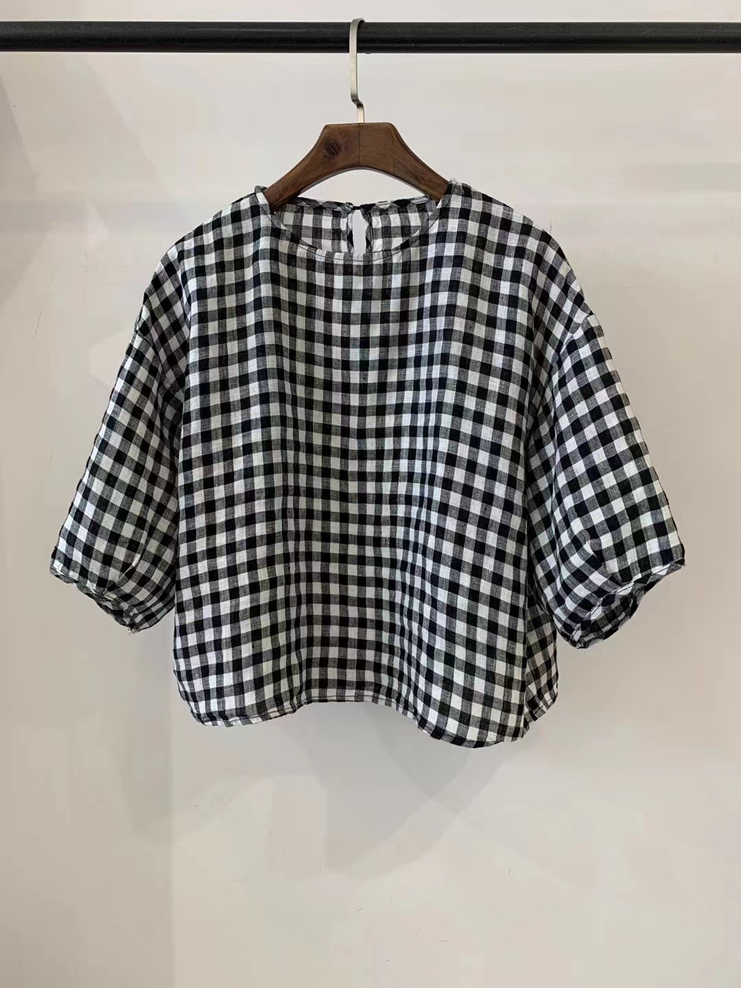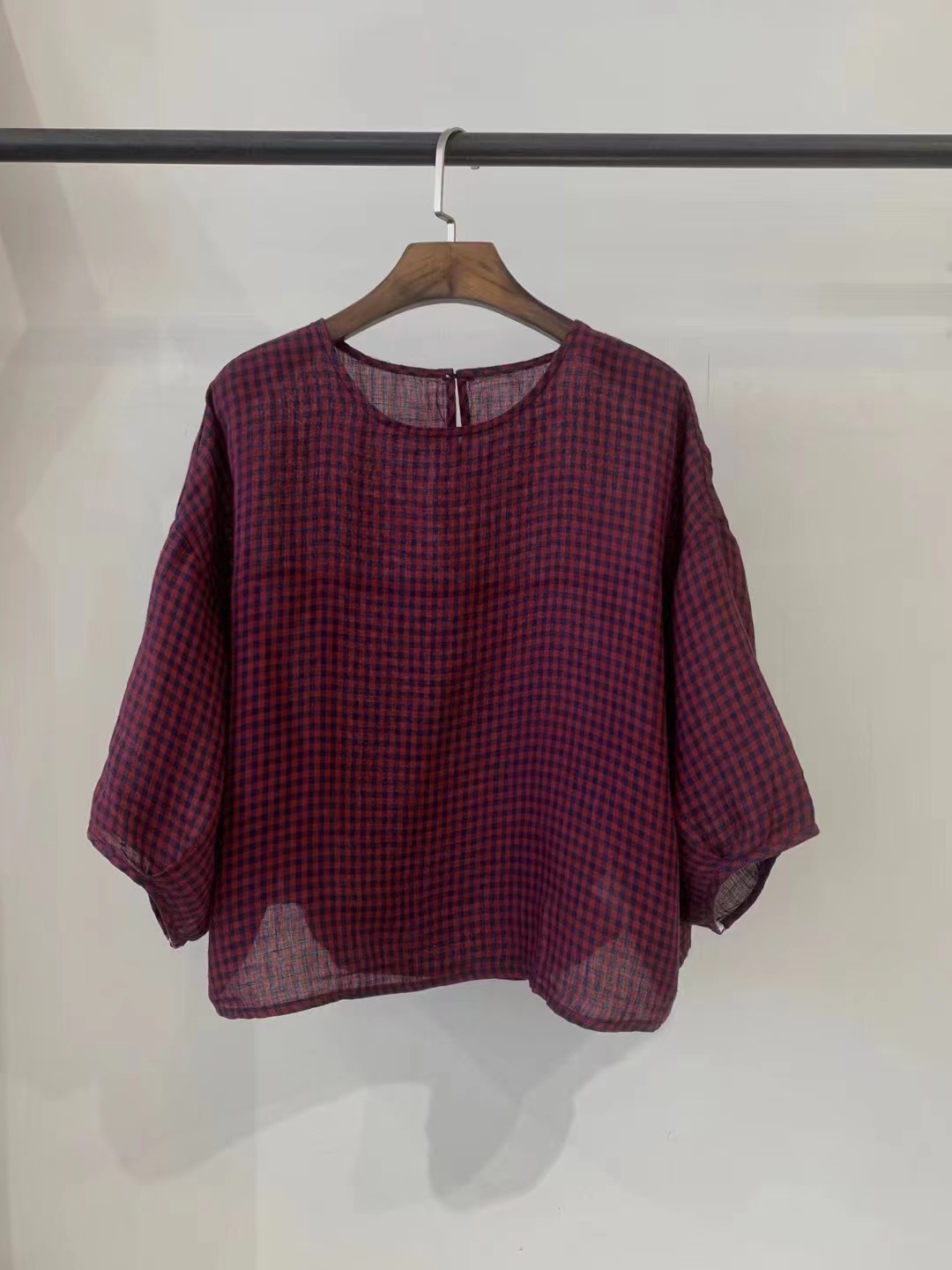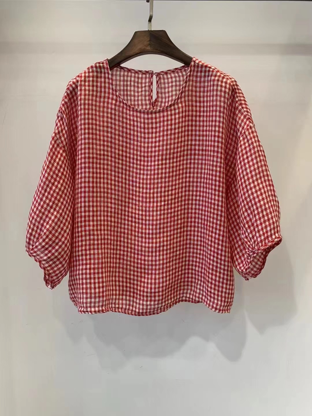 여성을위한 일본식 린넨 체크 무늬 셔츠 봄 새로운 느슨한 캐주얼 다목적 복고풍 예술적 연령 감소 셔츠 탑