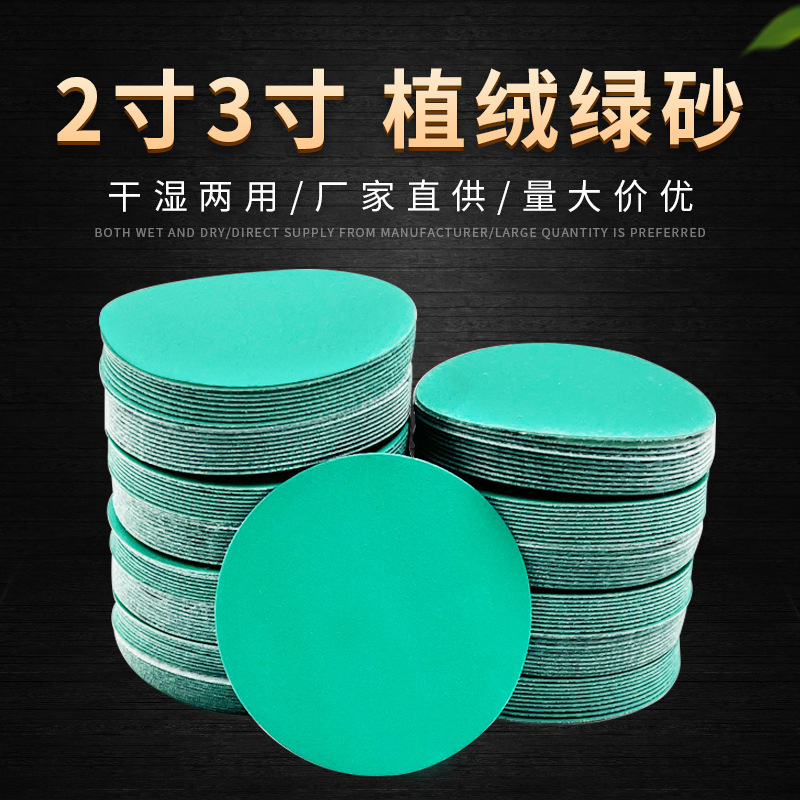 2 인치 3 인치 플로킹 사포 폴리 에스테르 필름 디스크 물 분쇄 녹색 사포 공압 연마 및 연마 벨벳 낮잠 시트스토어 가기