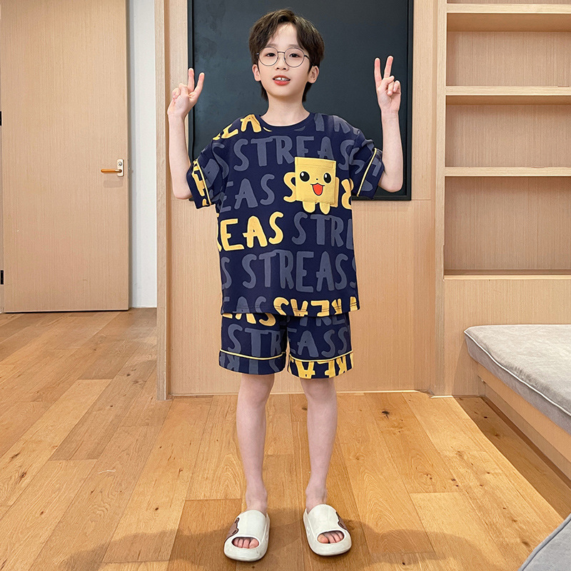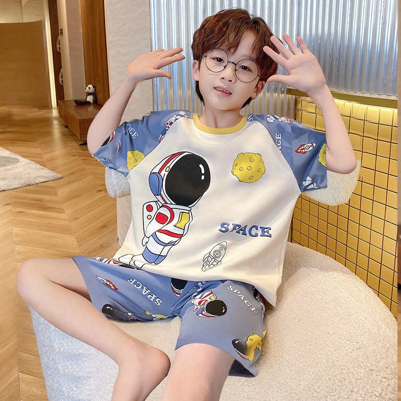남아용 잠옷 2025년 신상 순면 반팔 반바지 얇은 소재 남아용 분리형 세트 봄 여름용 아동 홈웨어스토어 가기