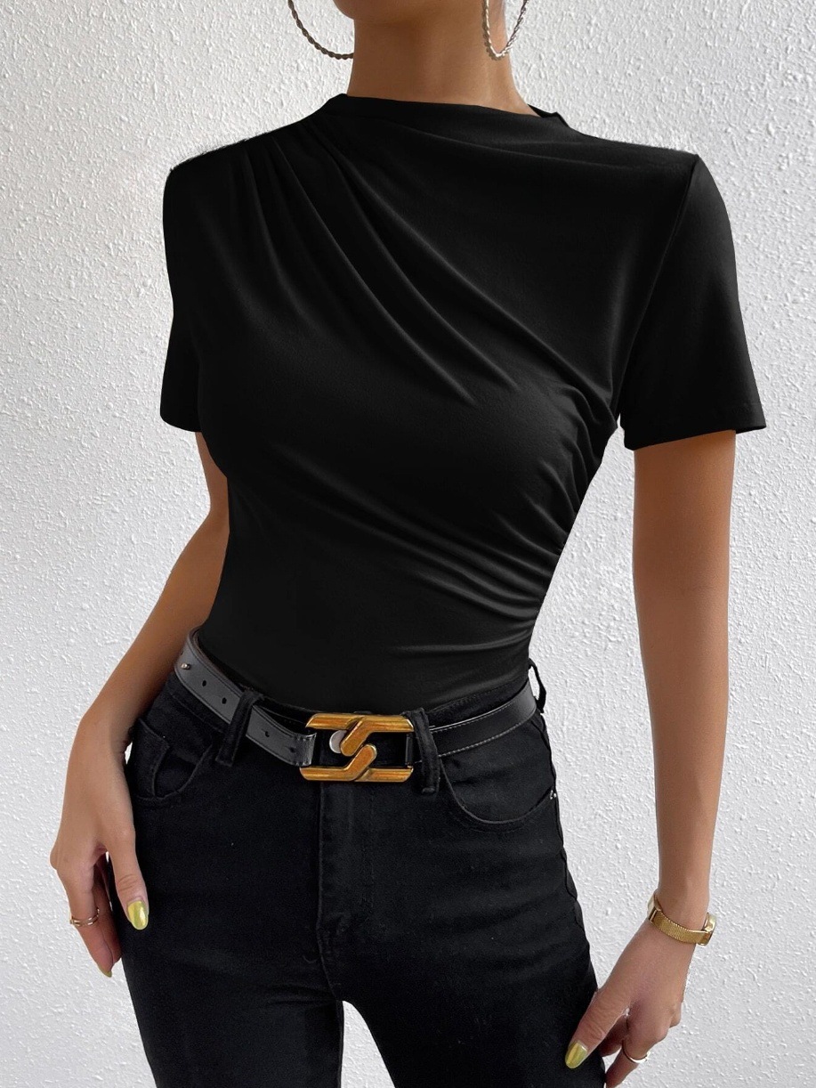 아마존 유럽과 미국의 국경 간 AliExpress 독립 역 2024 봄과 여름 작은 터틀넥 플리츠 슬림 핏 반팔 여성용 티셔츠