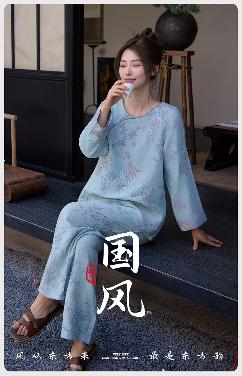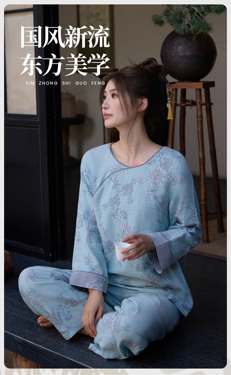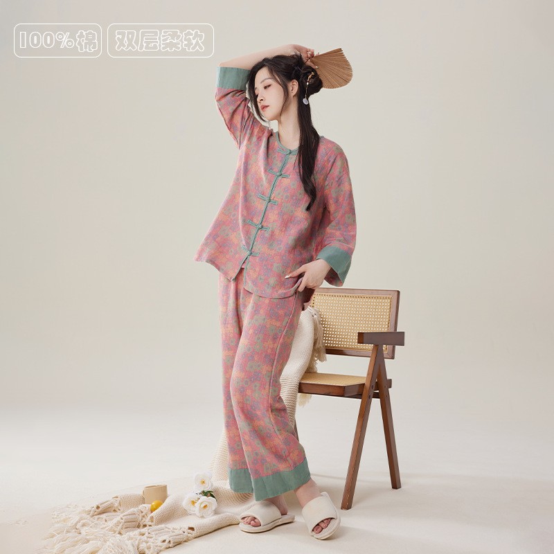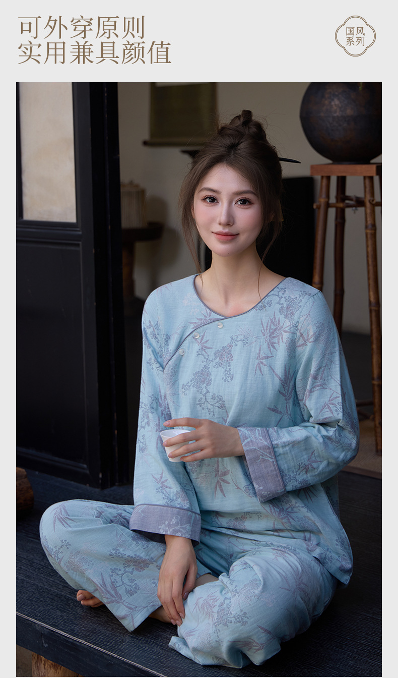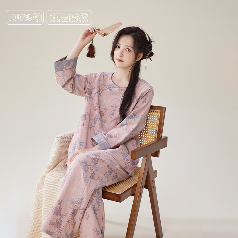 중국풍 잠옷 여성용 신형 중국풍 순면 이중 거즈 얇은 스타일 여성 봄 가을 긴팔 맞춤형 홈웨어 세트 도매스토어 가기