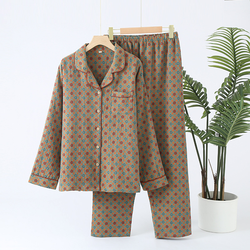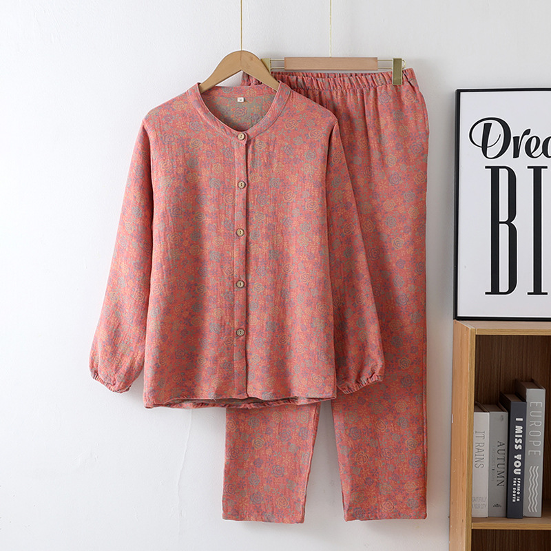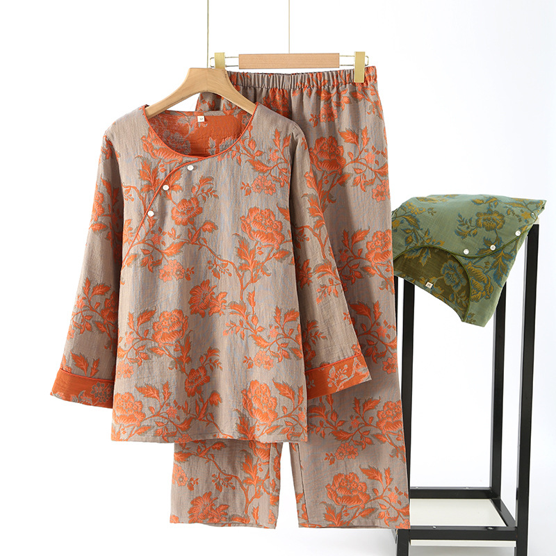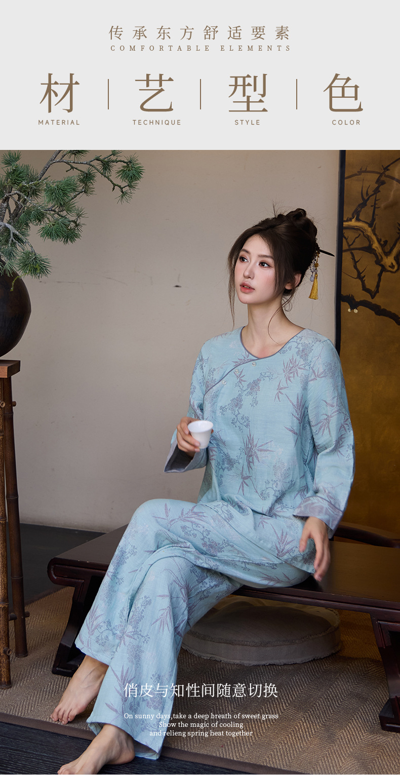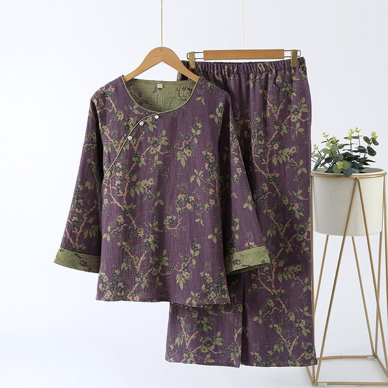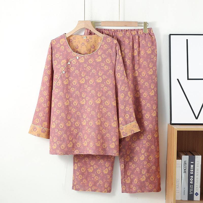 중국풍 잠옷 여성용 신형 중국풍 순면 이중 거즈 얇은 스타일 여성 봄 가을 긴팔 맞춤형 홈웨어 세트 도매스토어 가기