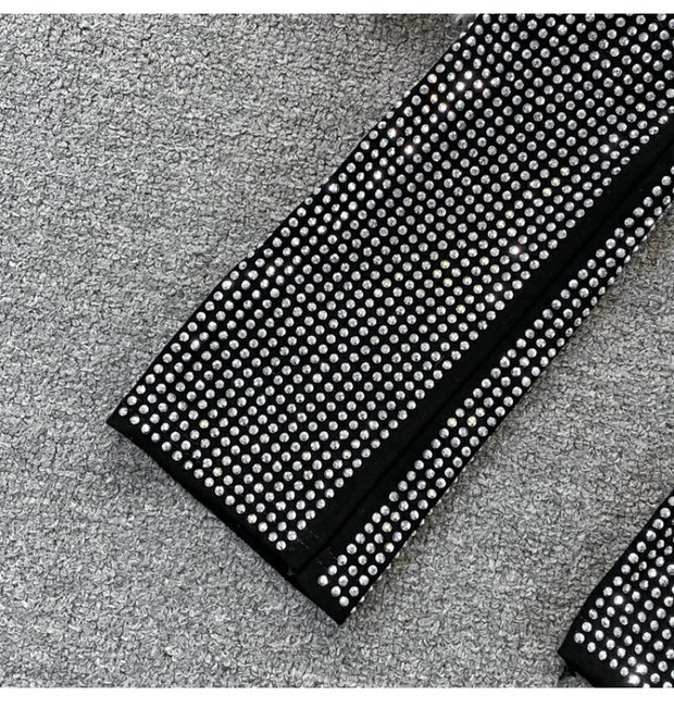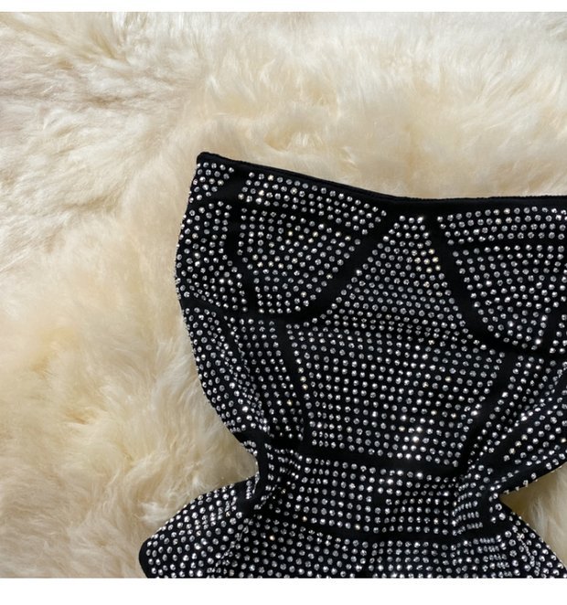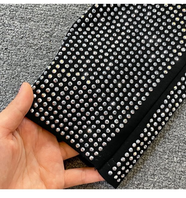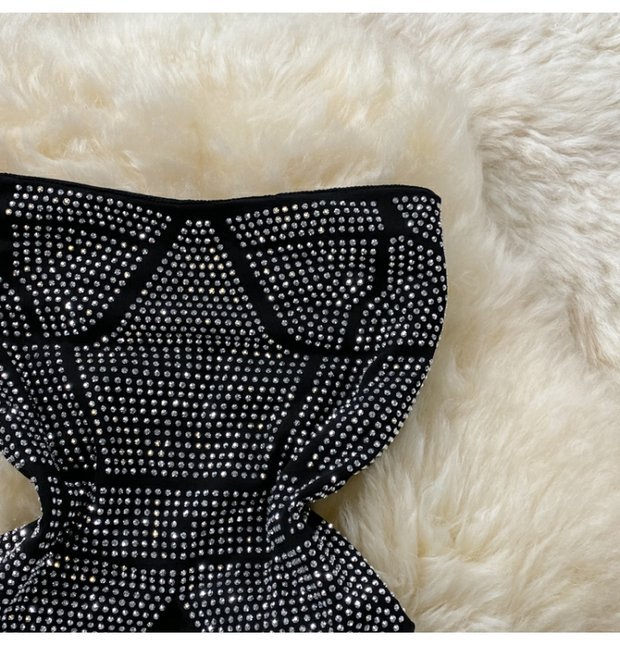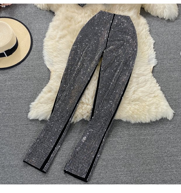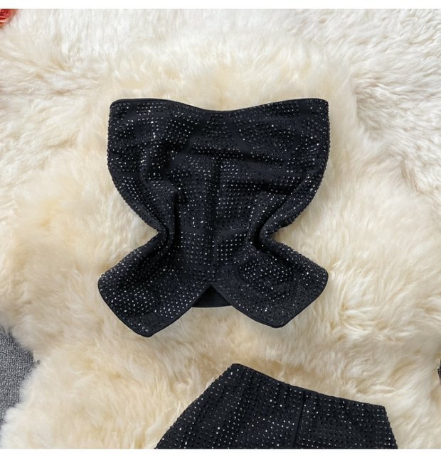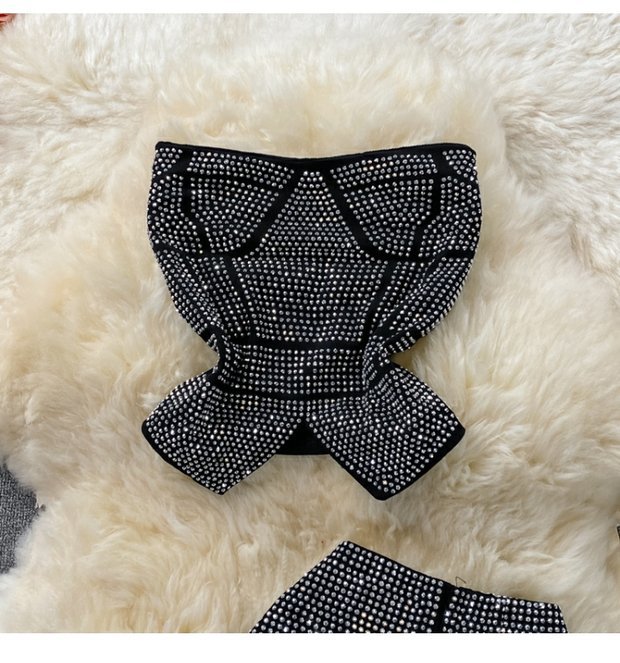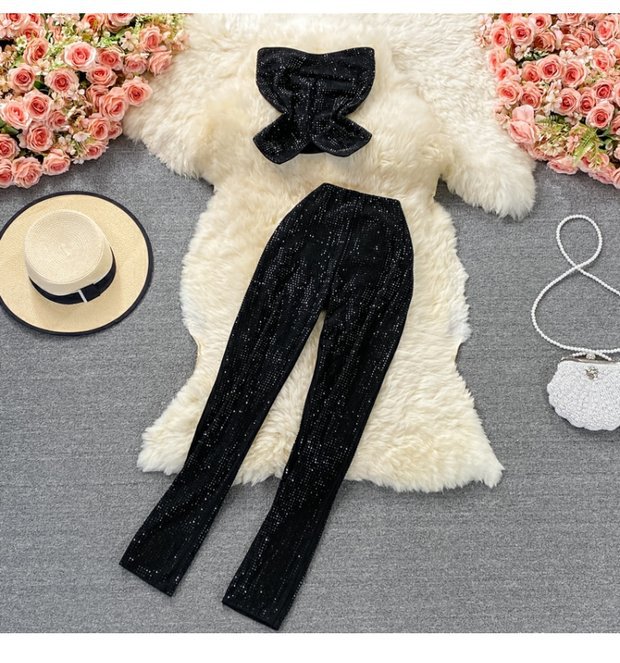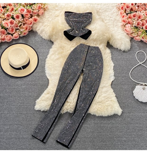 꽉 허리 주름 뜨거운 소녀 섹시한 짧은 모조 다이아몬드 튜브 상단 투피스 세트 여성을위한 높은 허리 스트레치 연필 바지