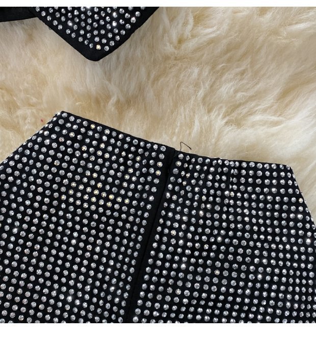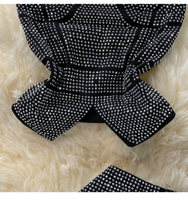 꽉 허리 주름 뜨거운 소녀 섹시한 짧은 모조 다이아몬드 튜브 상단 투피스 세트 여성을위한 높은 허리 스트레치 연필 바지스토어 가기